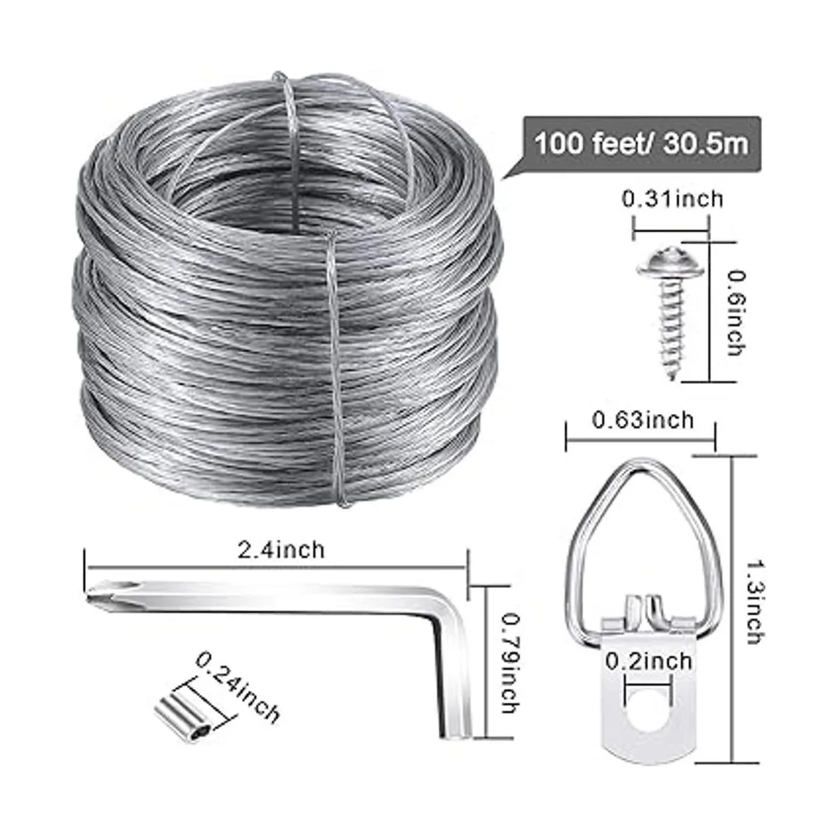 Kit de colgar imágenes, ganchos de imagen con anillo en D de Listenman con tornillos, alambre para colgar cuadros 100 pies y fundas de aluminio, soporta hasta 30 libras, destornillador incluido