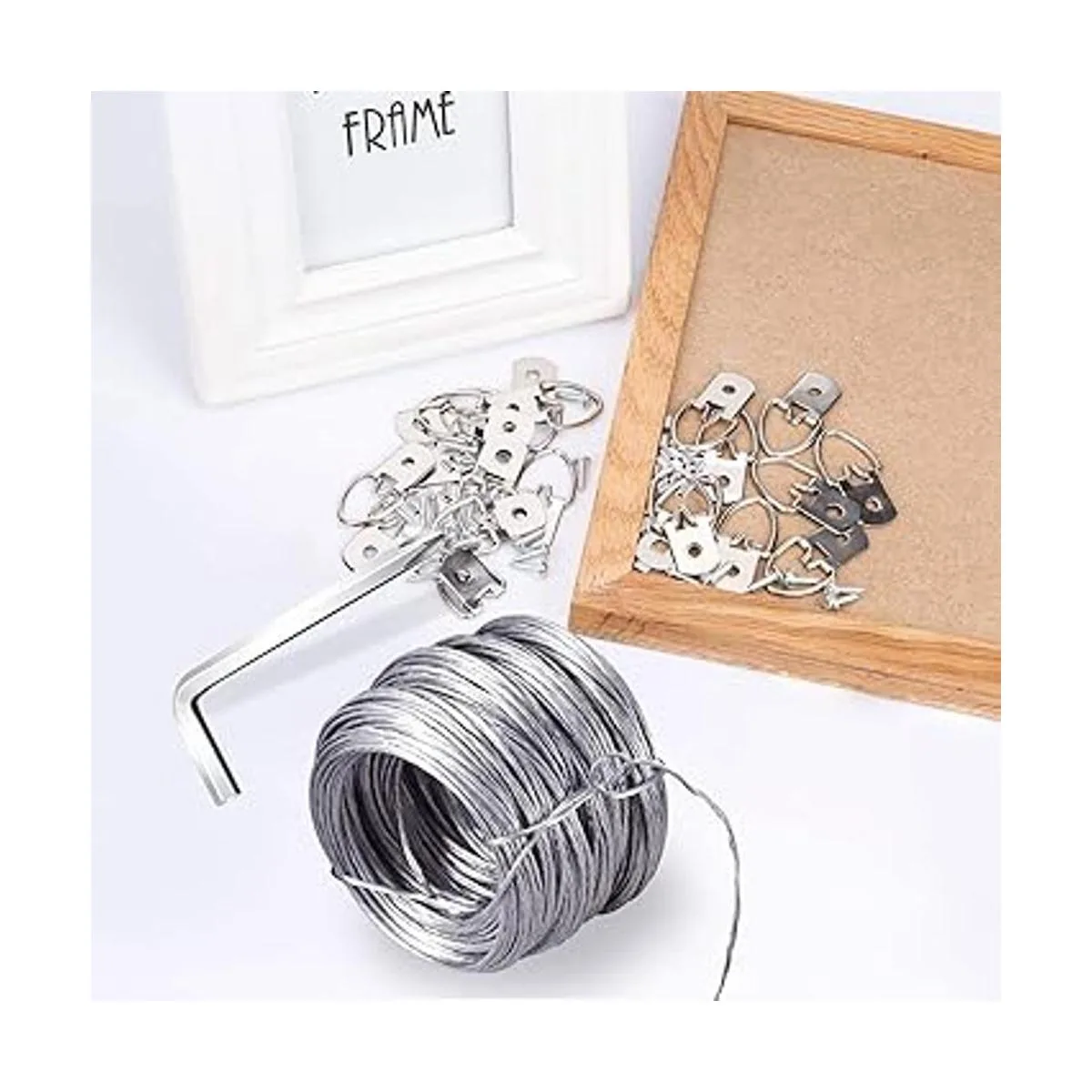 Kit para colgar imágenes de gran valor. El paquete incluye 20 ganchos de imagen con anillo en D, 20 tornillos y 20 fundas de aluminio, 1 rollo de alambre para colgar imágenes de 100.1 ft, 100 pies, 1 destornillador. Kit ideal para colgar imágenes, marcos de fotos, punto de cruz, proyectos de arte, carteles, espejos y decoración de pared.