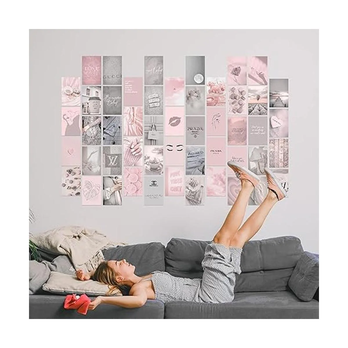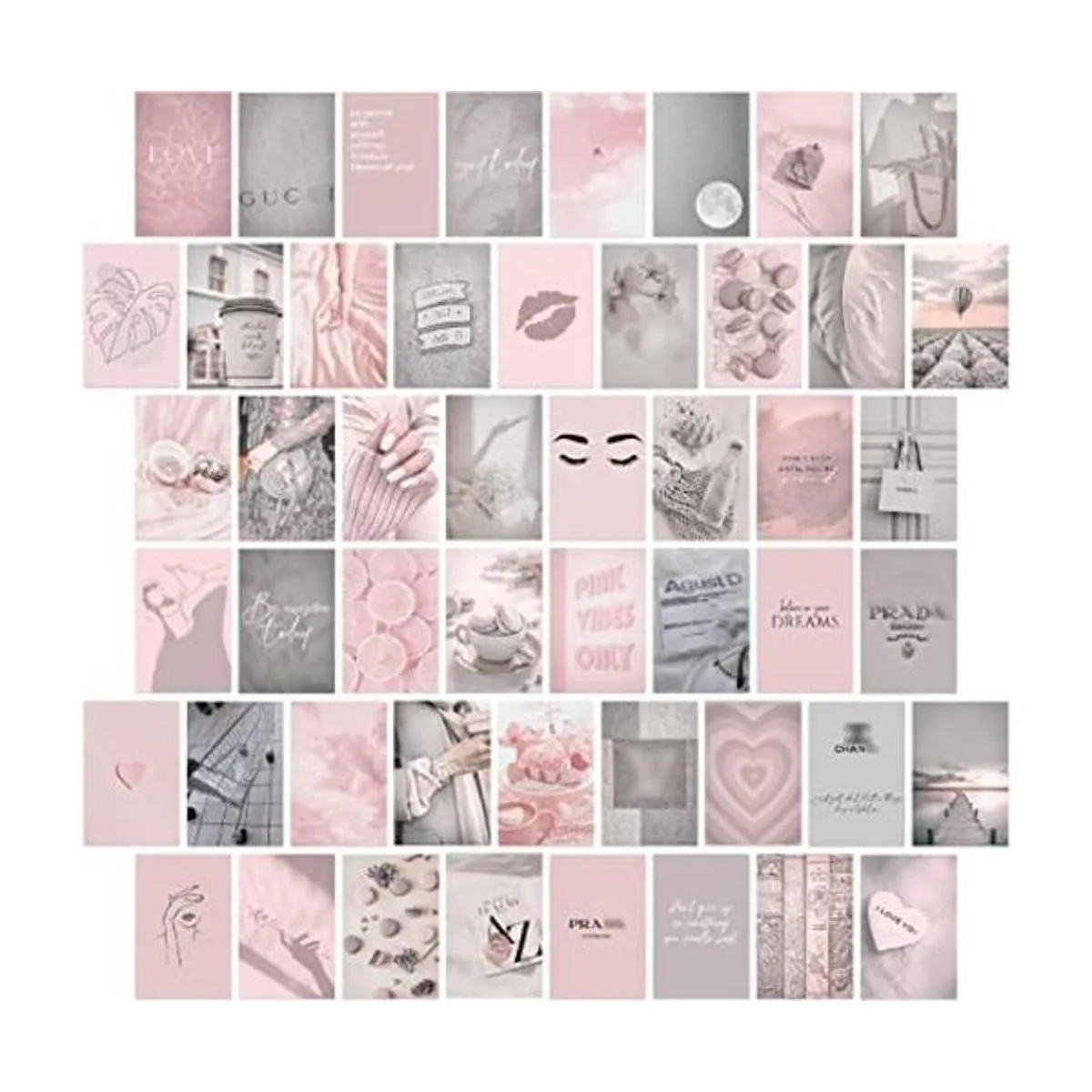 Kit de collage de pared estético rosa y gris: 50 imágenes estéticas de 4 x 6 pulgadas, 1 exquisita caja de embalaje y vienen con cinta redonda extraíble de doble cara.
