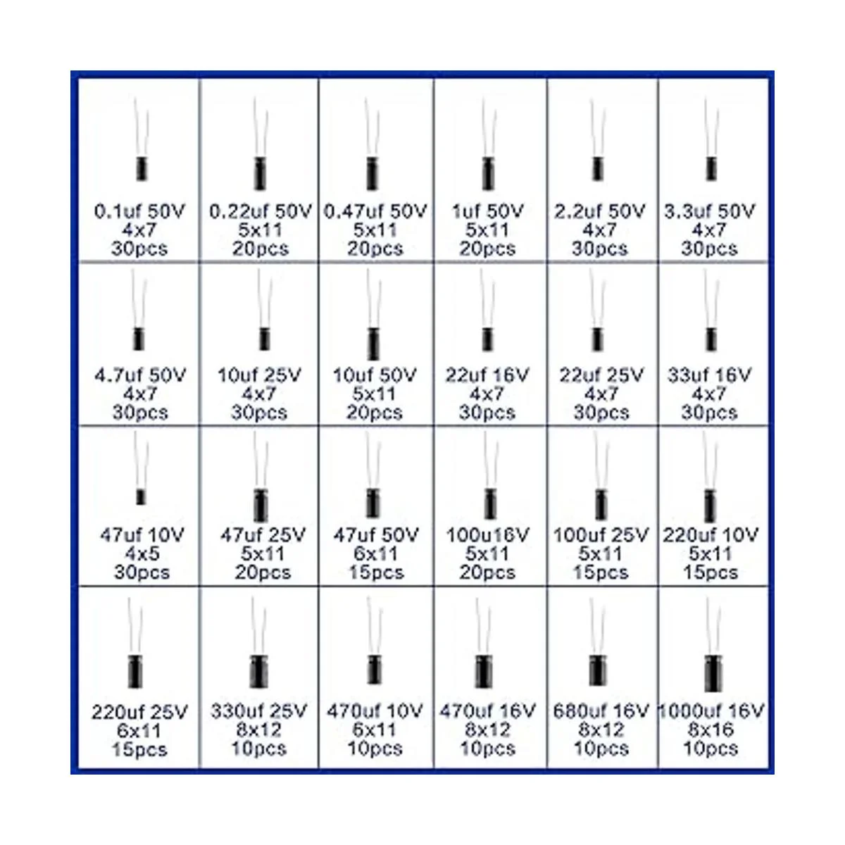 Kit de condensadores de varias especificaciones: viene con condensadores de 24 valores, rango de 0.1uF 1000 uF, condensador de aluminio de 16 V 25 V 50 V.
