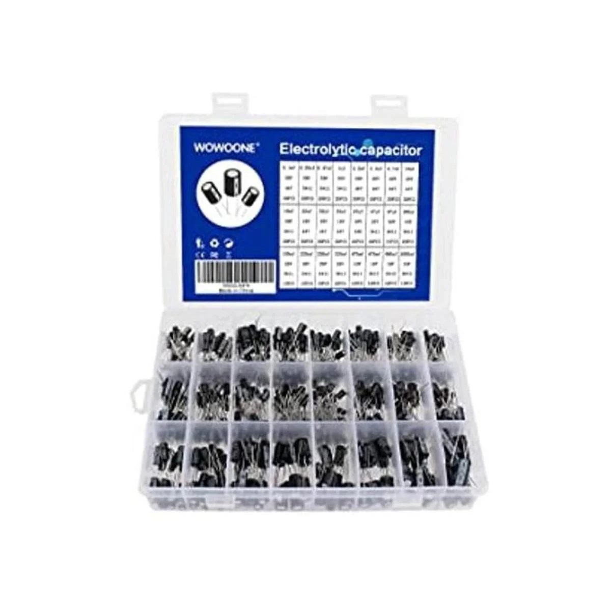 Kit de condensador electrolítico de aluminio de 24 valores, surtido de condensadores WOWOONE, rango radial tipo de plomo 0.1uF1000uF con caja surtida, para electrónica de pasatiempos, reparación electrónica de proyectos de audio y vídeo