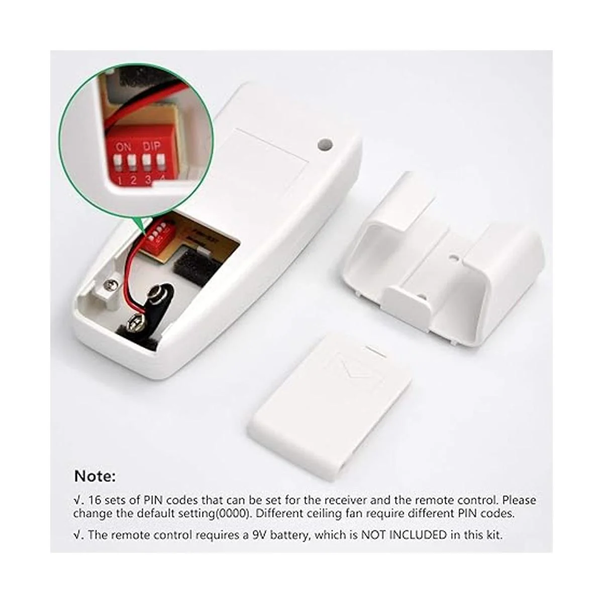 Nota: Ten en cuenta que este mando a distancia no tiene el botón de reversa. Si tu ventilador de techo tiene un interruptor de cadena de tracción, antes de usar el control remoto inalámbrico, utiliza el interruptor de cadena de tracción para encender la velocidad del viento al máximo y encender la luz del ventilador. Solo de esta manera se pueden utilizar juntos el interruptor de cadenas de tracción y el control remoto inalámbrico. El mando a distancia requiere una batería de 9 V para trabajar no incluida.