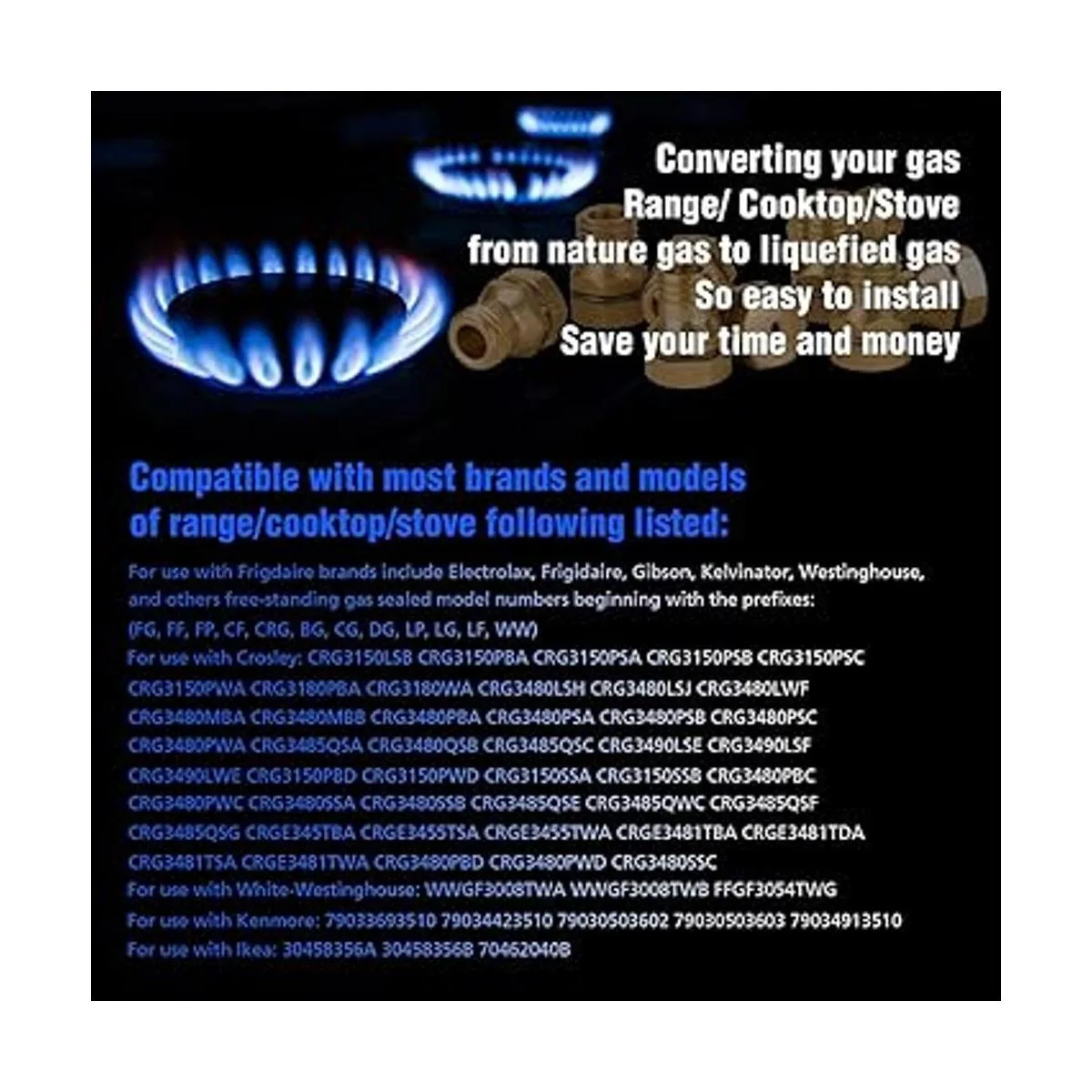 Compatibilidad: este kit de conversión LP es adecuado para la mayoría de modelos de estufa/rango/cocina, no solo para Frigdaire. Para uso con productos para el hogar Electrolax números de modelo sellados a gas que comienzan con los prefijos FG, FF, FP, CF, CRG, BG, CG, DG, LP, LG, LF, WW