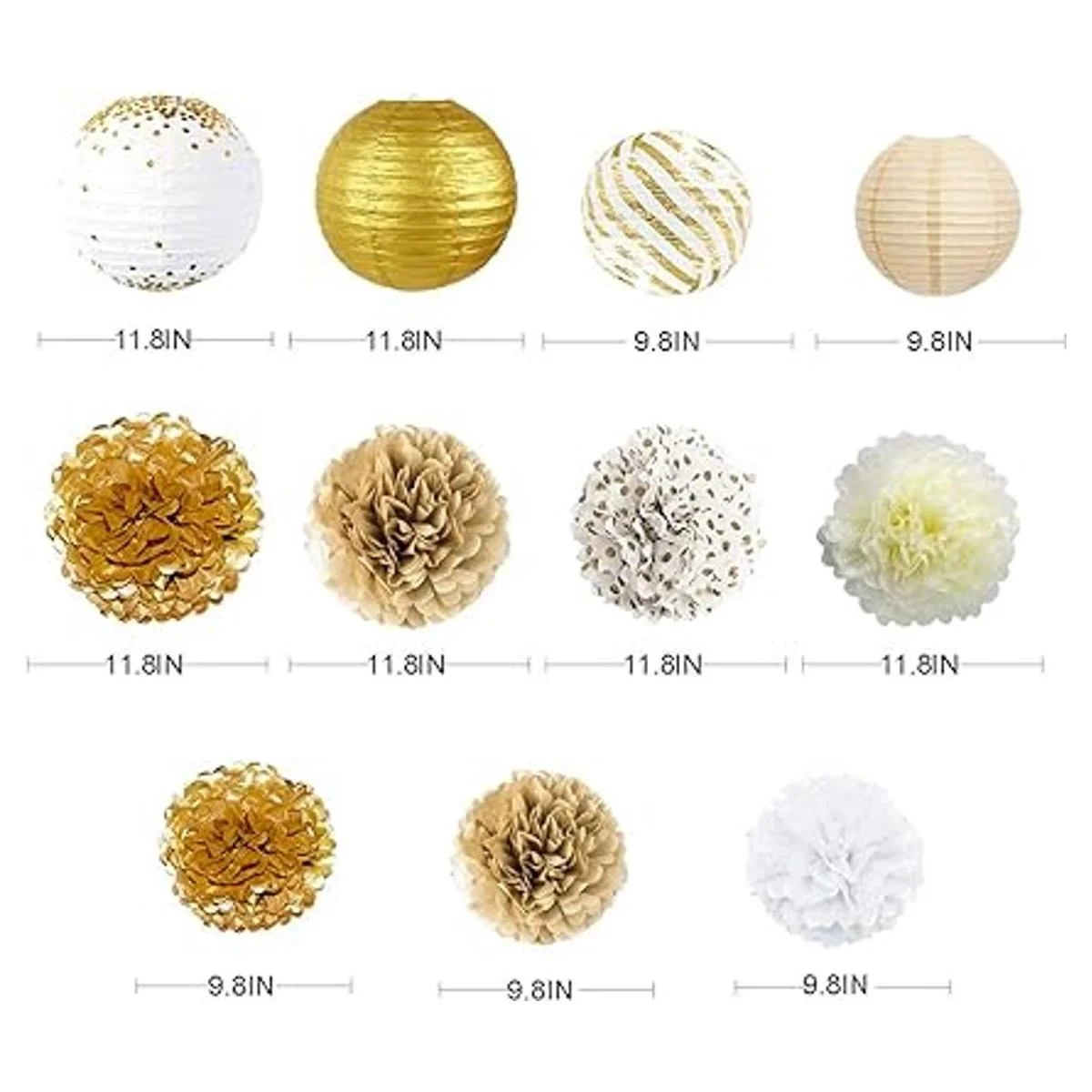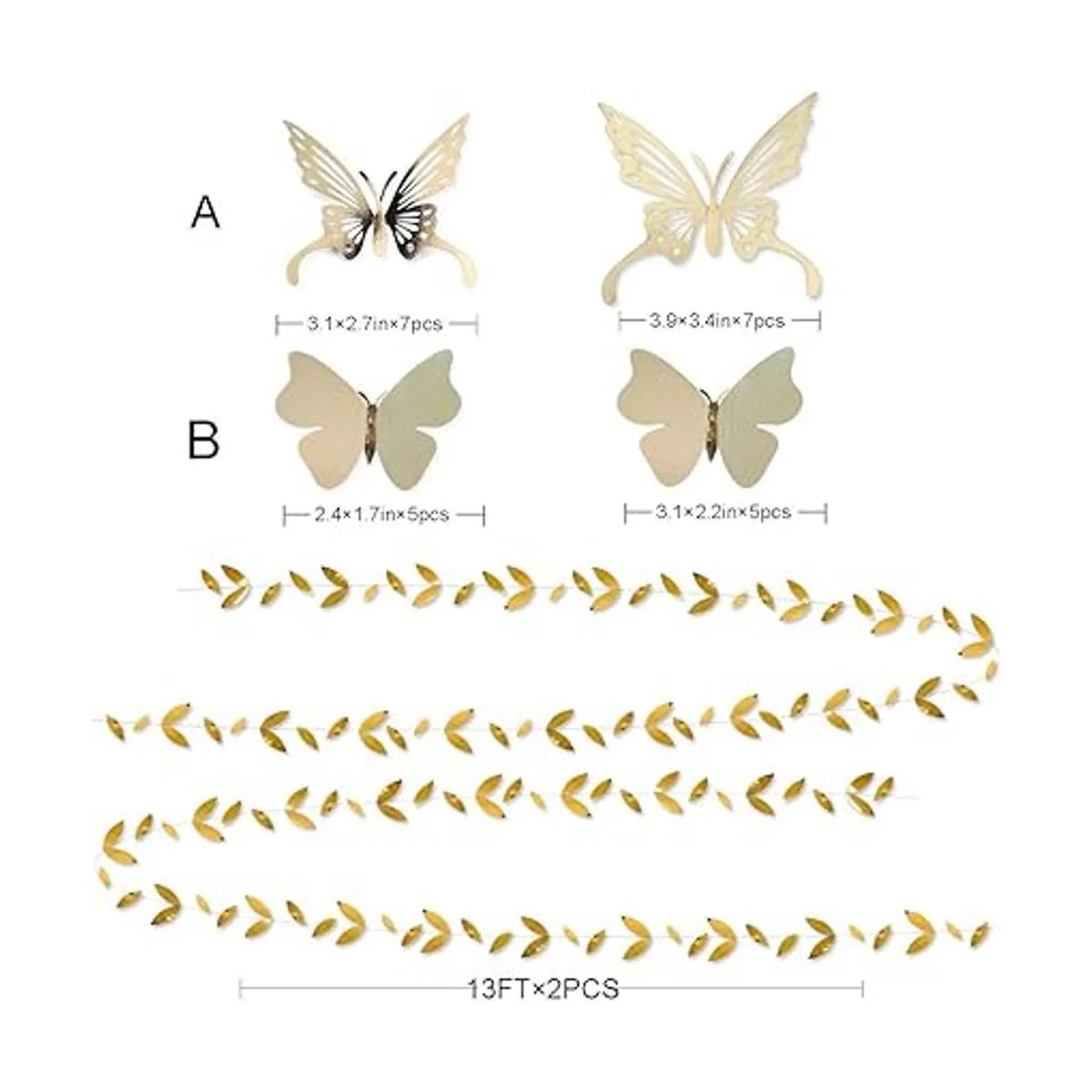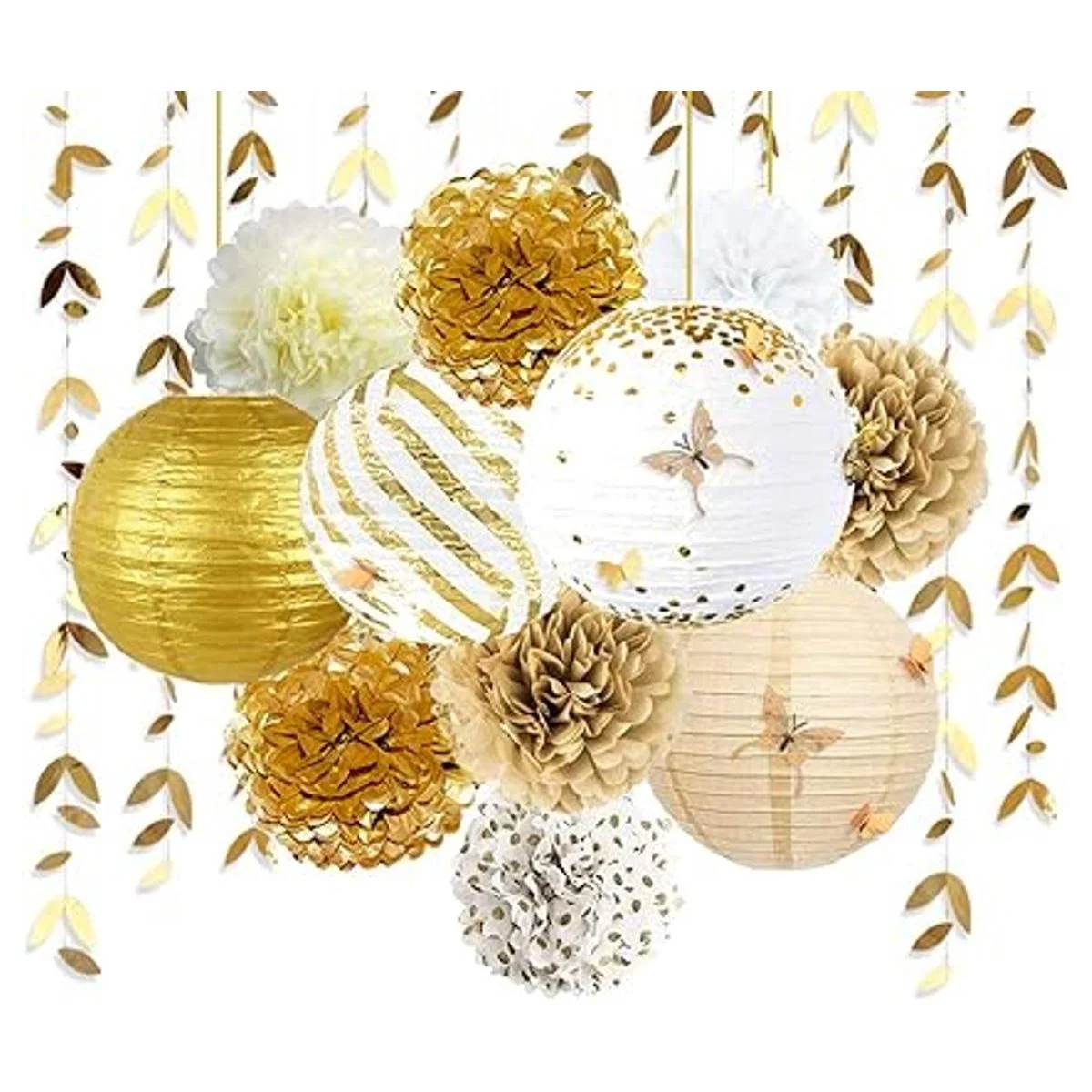 El paquete contiene: 2 guirnaldas metálicas de hojas doradas, 7 pompones de flores de papel de seda, 4 linternas de papel, 24 calcomanías de mariposa doradas, 4 cintas doradas. Total 41 piezas.