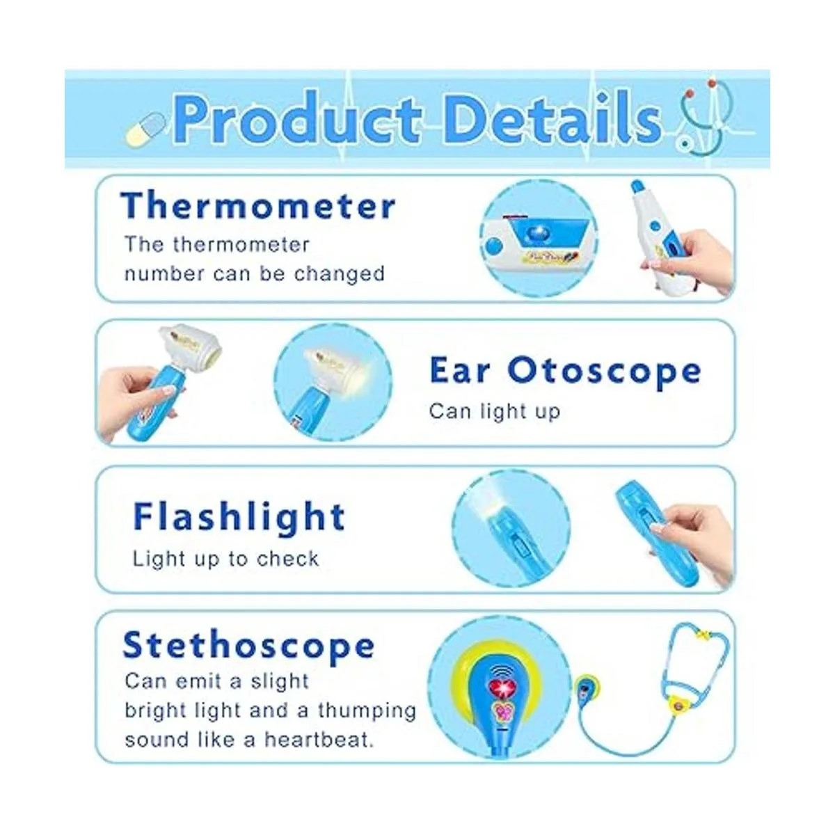 Kit de médico realista para niños: este juguete para niños pequeños es realista. Cuando los niños presionan el estetoscopio, pueden escuchar el latido del corazón; el estetoscopio, el termómetro y el otoscopio pueden iluminar en el trabajo, dando a los niños una experiencia más auténtica durante el juego.