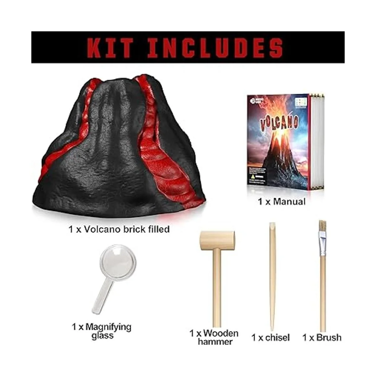 El paquete incluye: este kit Mega Dig incluye todo lo que necesitas. El volcán de excavación grande con 15 tipos de gemas enterradas en el interior, cincel, mazo, cepillo, lupa, hermosa guía de aprendizaje e instrucciones idioma español no garantizado.