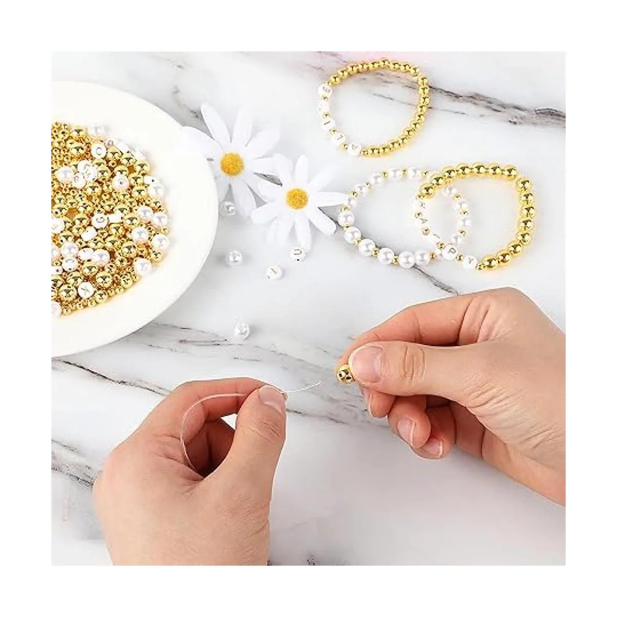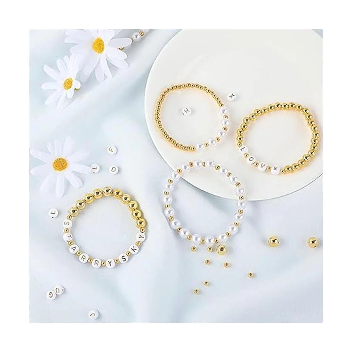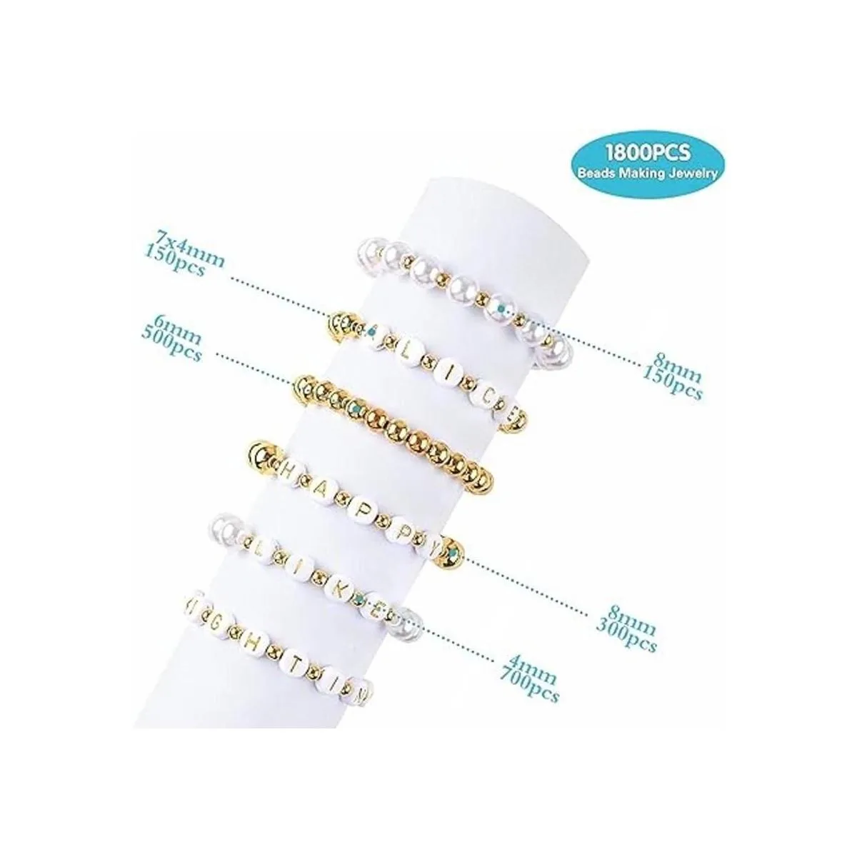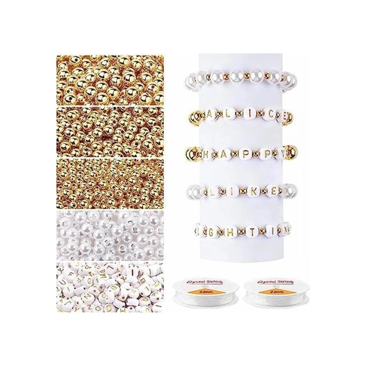 Kit de fabricación de 1800 cuentas, 1500 cuentas espaciadoras redondas doradas, cuentas sueltas lisas, 150 cuentas del alfabeto, 150 cuentas blancas y 2 rollos de cuerda elástica para hacer pulseras, manualidades