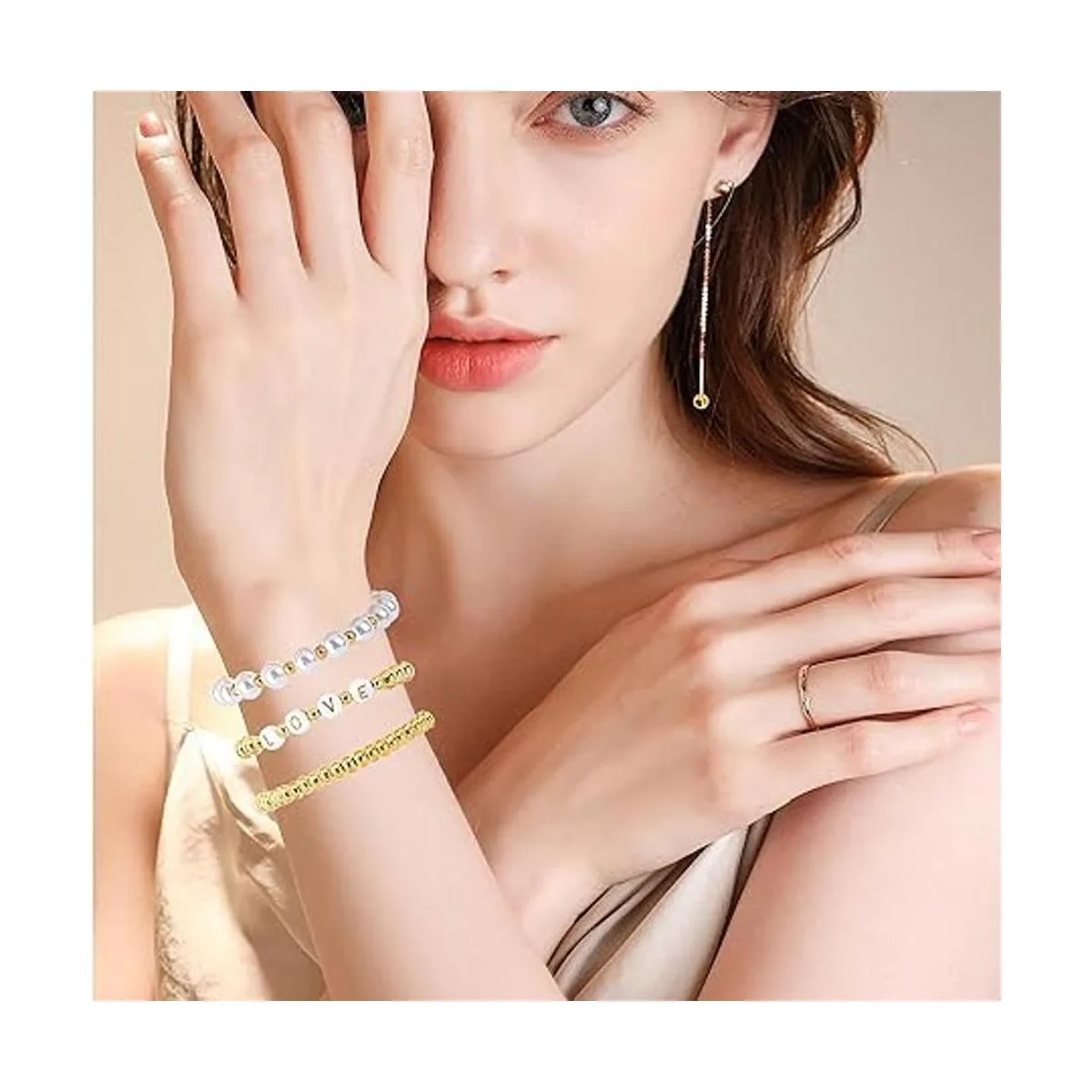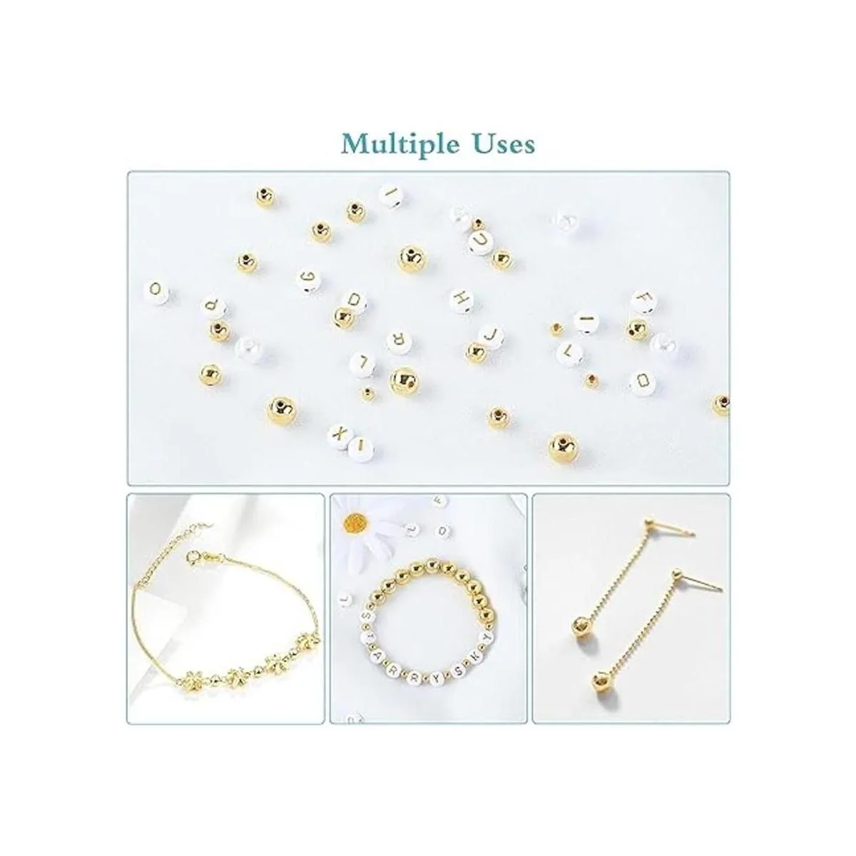Amplia gama de aplicaciones: las cuentas redondas doradas se pueden aplicar ampliamente en varios proyectos de fabricación de joyas, como pulseras, collares, aretes, colgantes, etc. Simplemente apila las cuentas de oro juntas, ideal para encordar con nuestras cuentas de perlas y cuentas de letras del alfabeto, que pueden crear una hermosa pulsera. También es adecuado para combinar con otros artículos de manualidades para crear un efecto de capas.