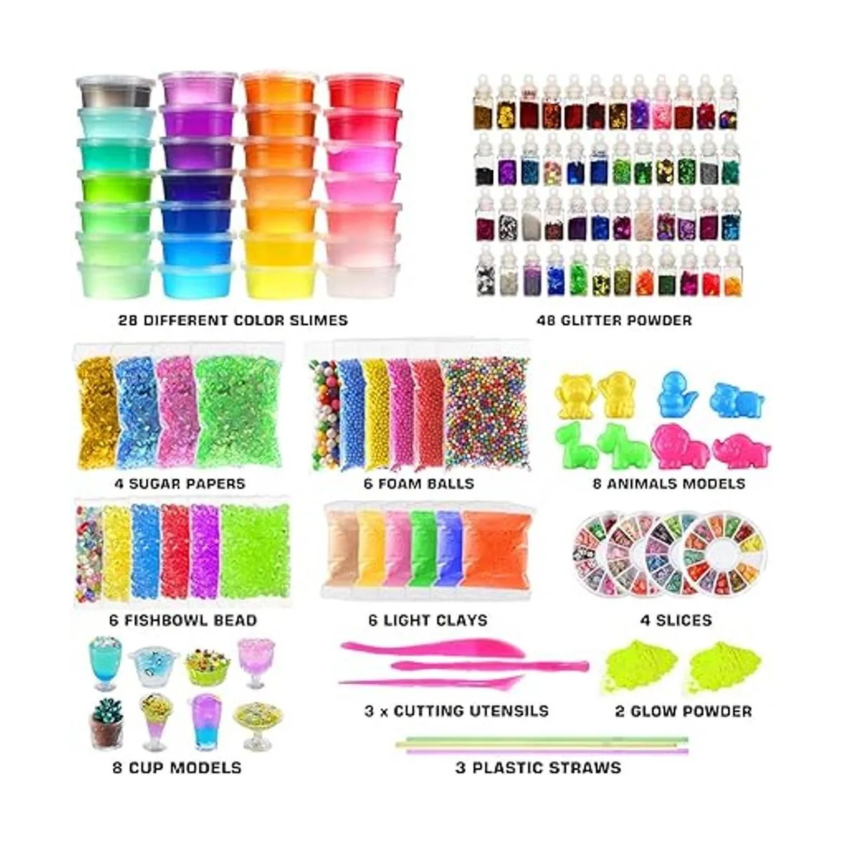 Kit de fabricación de limo de bricolaje de 126 piezas para niñas y niños, idea de cumpleaños para niños a partir de 5 años. Los mejores suministros de limo esponjoso incluyen 28 limos de cristal, 2 polvos que brillan en la oscuridad, 48 frascos con purpurina, etc.