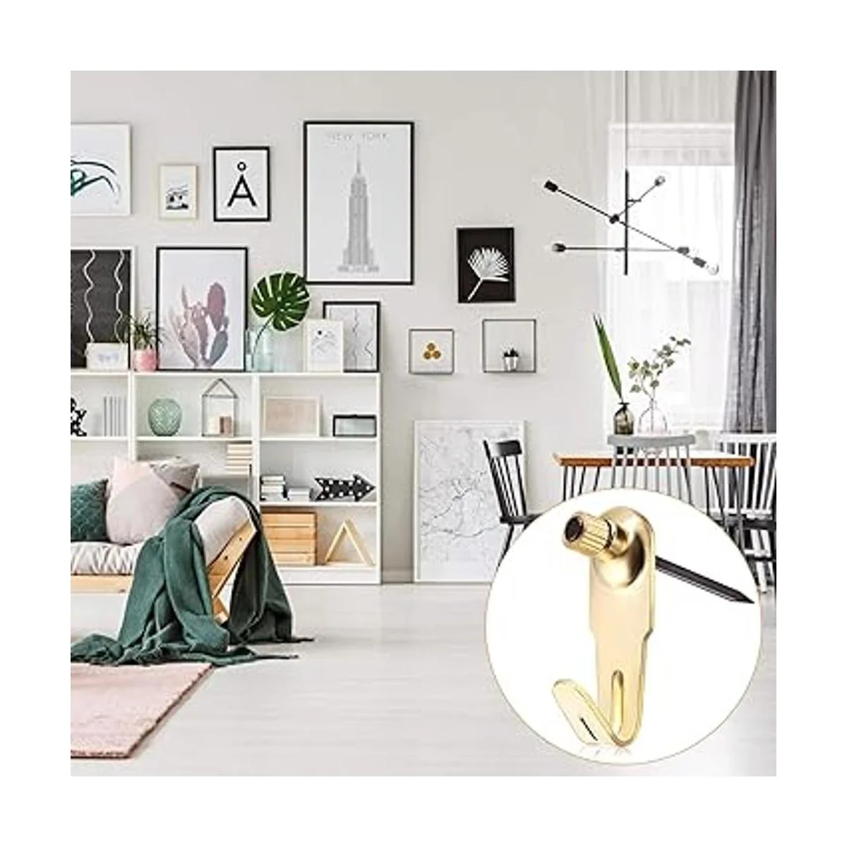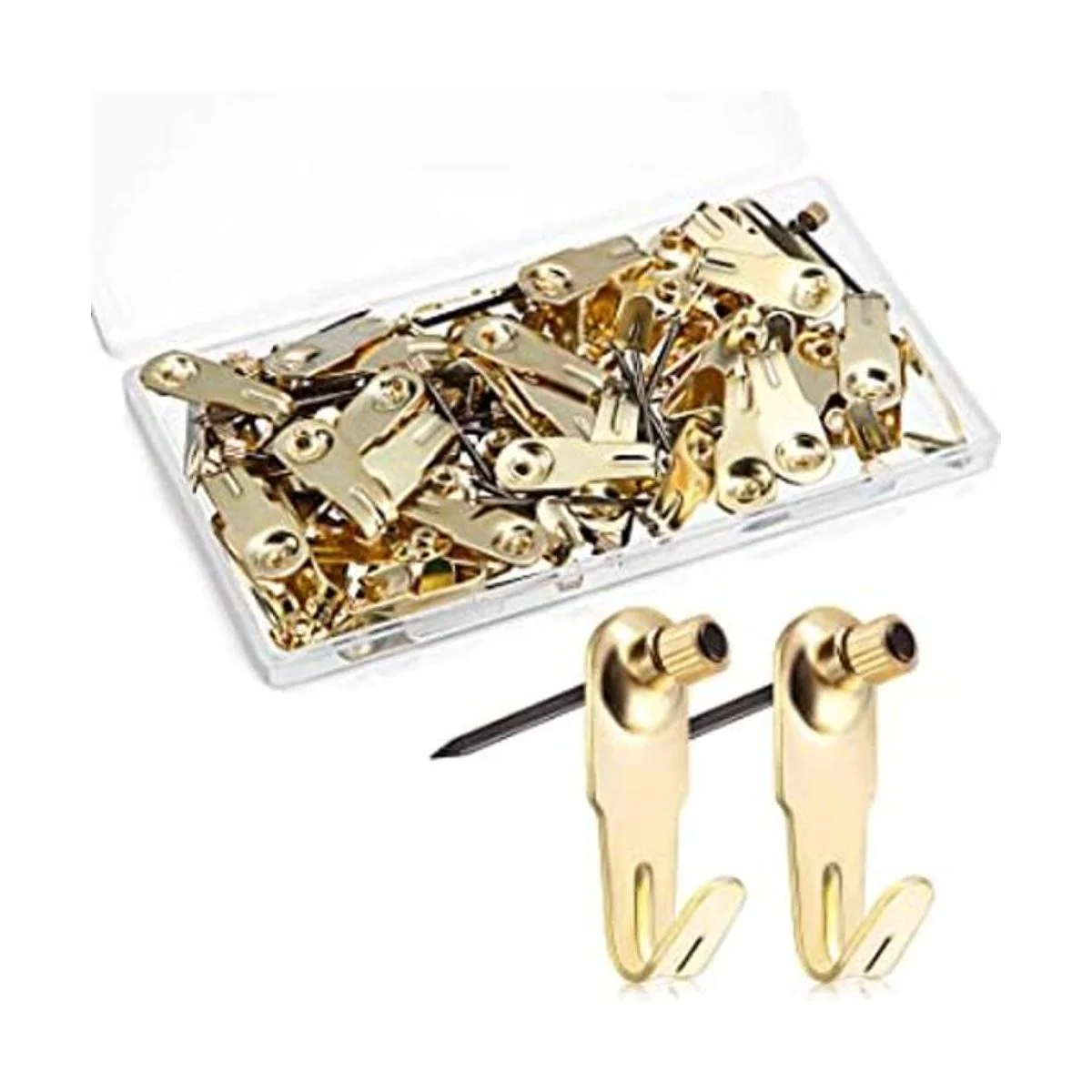 Kit para colgar imágenes: el paquete viene con 50 perchas de fotos doradas y 50 clavos de pared, y puede soportar objetos de menos de 20 libras; con abundante cantidad y carga pesada, el kit para colgar cuadros es un ayudante para satisfacer tus necesidades de una casa ordenada