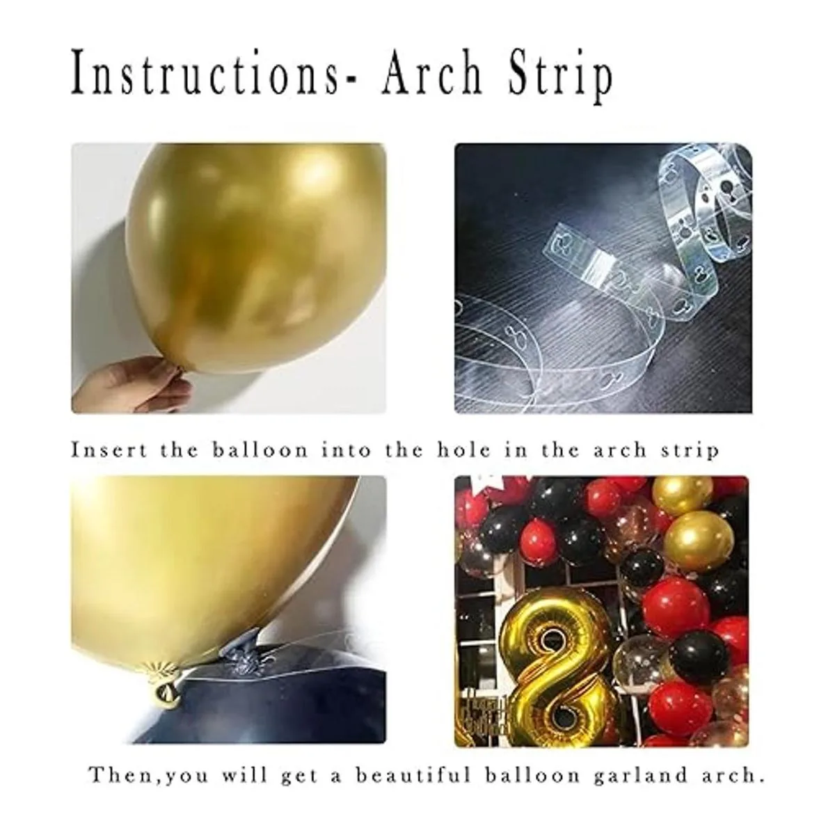 Fácil de montar : es fácil hacer una gran y hermosa guirnalda de globos de oro rojo y negro, inflar los globos dorados metálicos negros e insertar el nudo del globo en los agujeros de la cinta de tira de arco, llena toda la tira de arco y obtendrás un arco de globo negro dorado. Cuelga otros globos con cintas rojas y negras doradas y punto de pegamento de globos en el techo de la ventana o la pared, hará que tu fiesta nocturna de Vegas Poker se vea genial