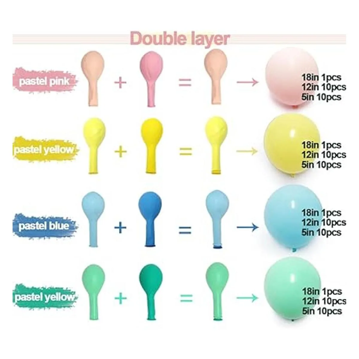 El paquete incluye: globos de doble relleno verde menta de 18/12/5 pulgadas 21 piezas, globos de doble capa rosa bebé de 18/12/5 pulgadas 21 piezas, globos de color amarillo pastel doble de 18/12/5 pulgadas 21 piezas, 1 rollo de tira de guirnalda de globos 16 pies , 1 rollo de puntos de pegamento para globos 100 puntos de pegamento y cinta rizadora blanca 33 pies