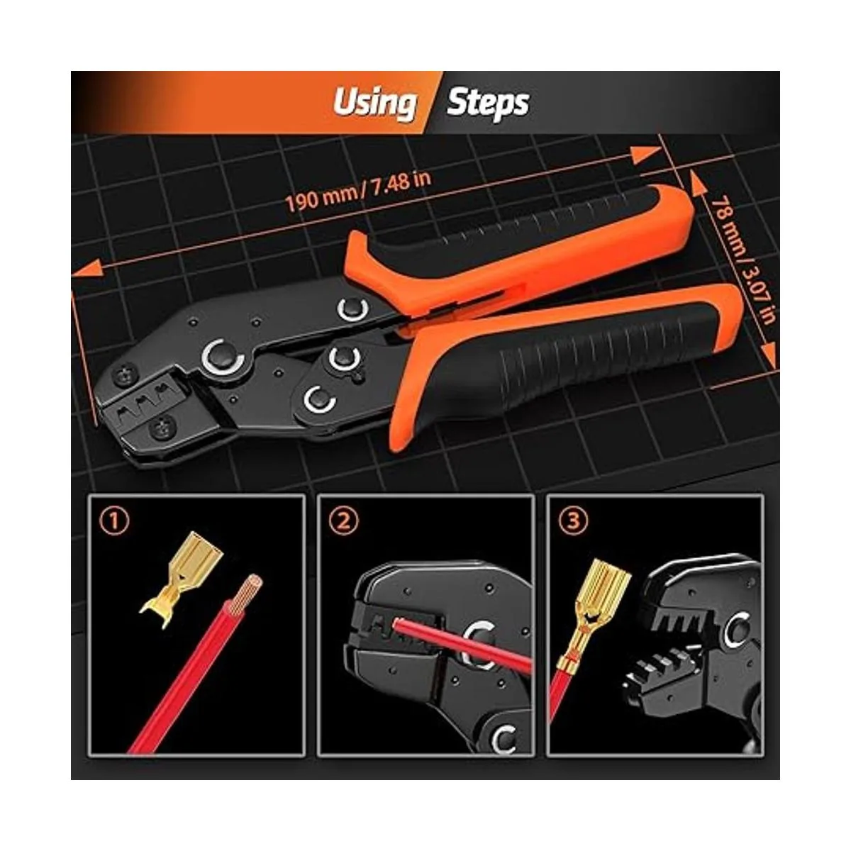 Herramienta de crimpado ajustable Con un mecanismo de trinquete de ajuste automático, un dispositivo de bloqueo ajustable y la función de liberar puntos de presión. La herramienta crimpadora está diseñada para engarzar barril abierto no aislado de 2414 AWG, terminales estilo OEM y empalmes de alambre. Proporciona el servicio de crimpado perfecto para el conector que compres.