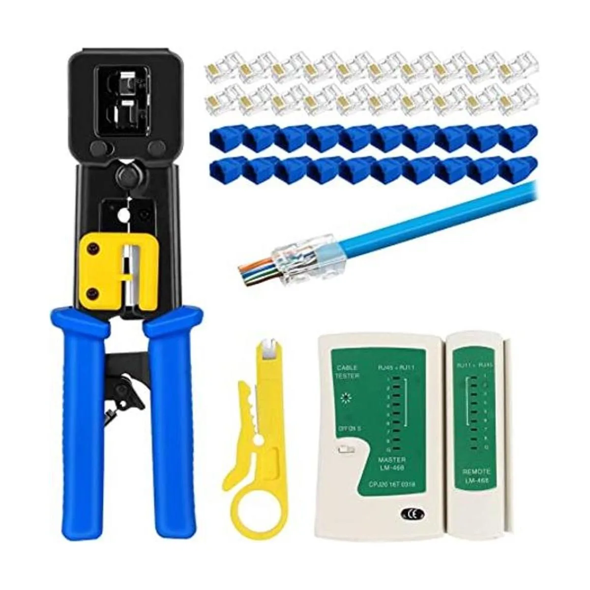 Kit de herramientas de crimpado RJ45 Pass Thru Cat5 Cat5e Cat6 RJ45 Herramienta de crimpado con 20 conectores de paso RJ45 Cat6, 20 cubiertas, 1 cortador de perforación de cables y 1 probador de cables de red