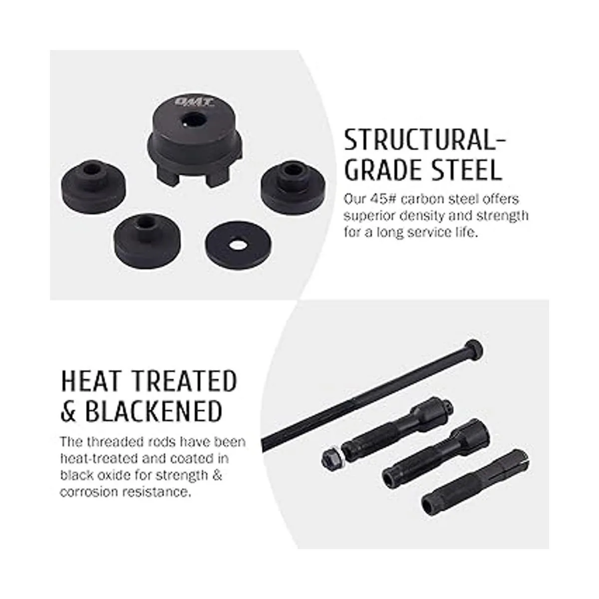 Construido para durar: hecho de acero al carbono medio AISI 1045 de alta calidad, este juego de instalador y extractor de rodamientos proporciona un servicio fuerte y fiable a largo plazo; las varillas roscadas están tratadas con calor y ennegrecidas para una mayor resistencia y resistencia a la corrosión