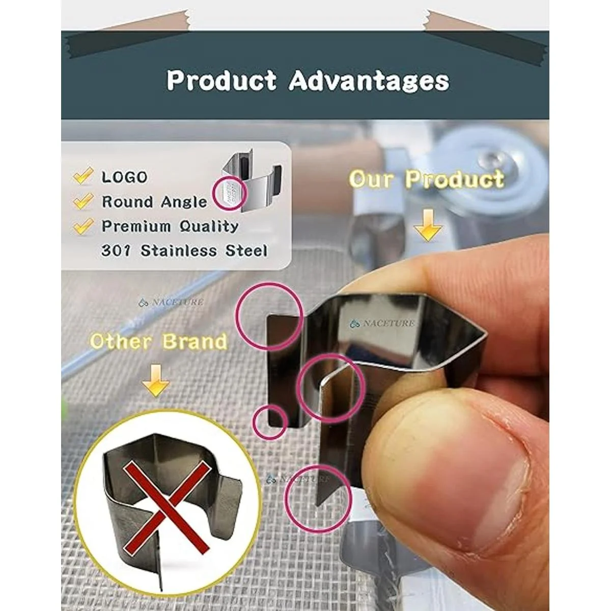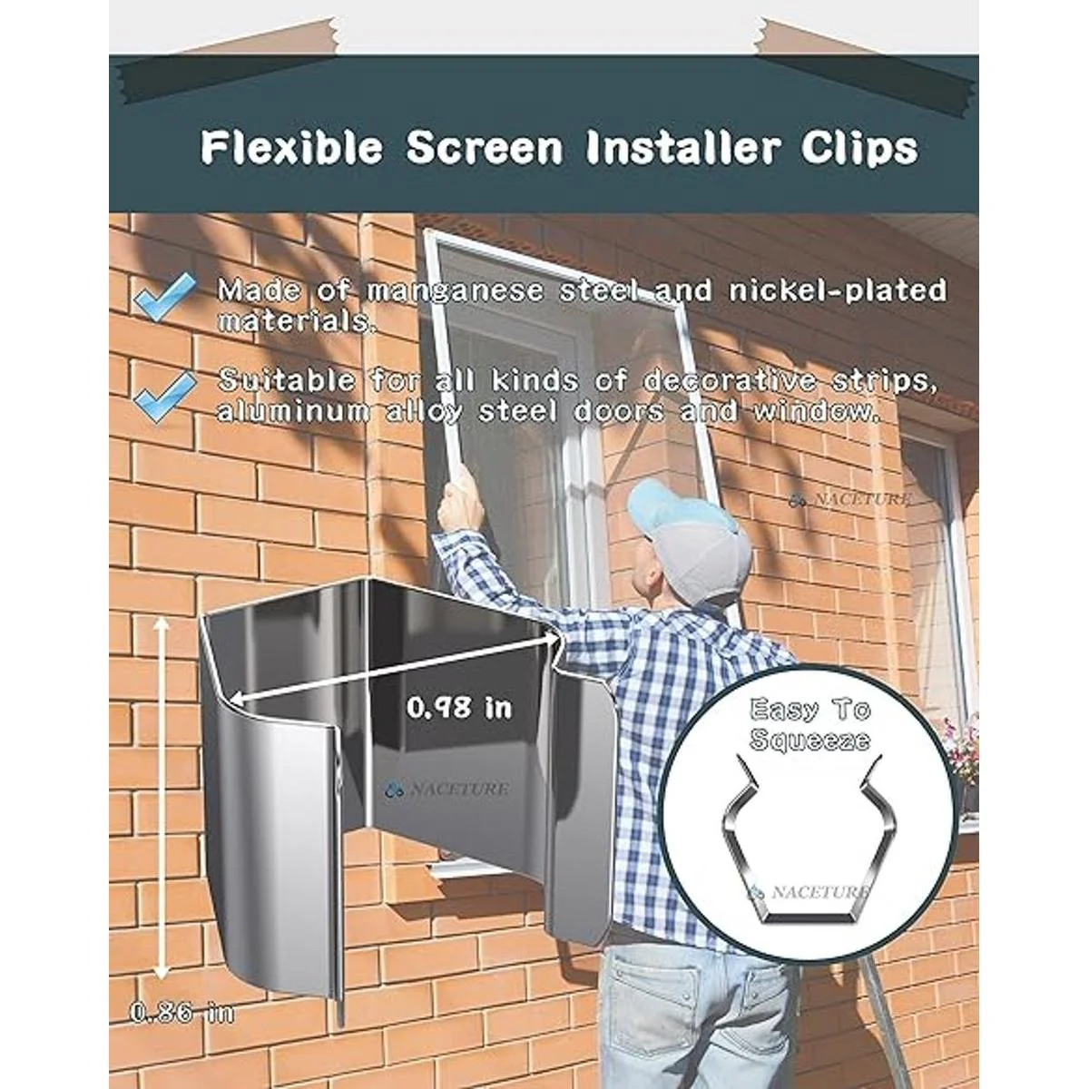 Clips flexibles para instalar pantallas: estos clips para puertas y ventanas te ahorrarán tiempo y esfuerzo al instalar pantallas de patio, porche y garaje. Hecho de acero de manganeso y materiales niquelados, con una increíble flexibilidad que puede hacer que la herramienta de rodamiento estriado sea más fácil de alinear y mantener la pantalla apretada.
