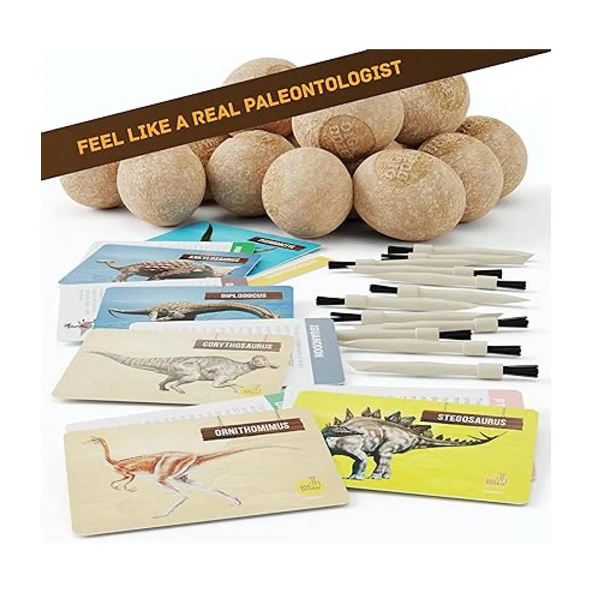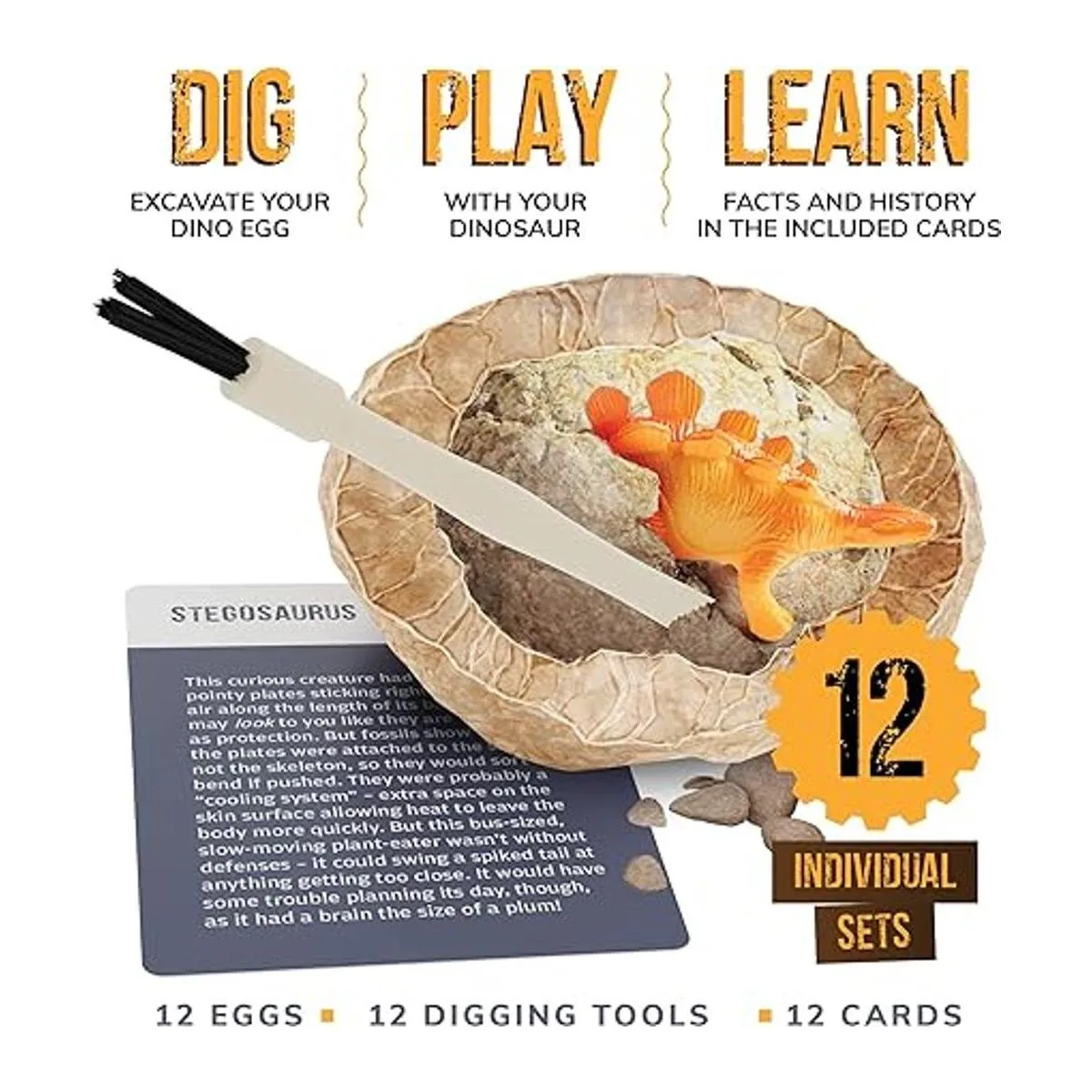 El kit incluye: 12 huevos Dino con un único dinosaurio de juguete en cada uno, 12 cinceles/cepillos, 12 guías de instrucciones y 12 hermosas tarjetas de aprendizaje de colores completos, una para cada dino. Todo viene empaquetado en una elegante caja de exposición. Incluye todo lo necesario para que el joven científico excave los dinos con facilidad, y obtener una comprensión más profunda de ellos.