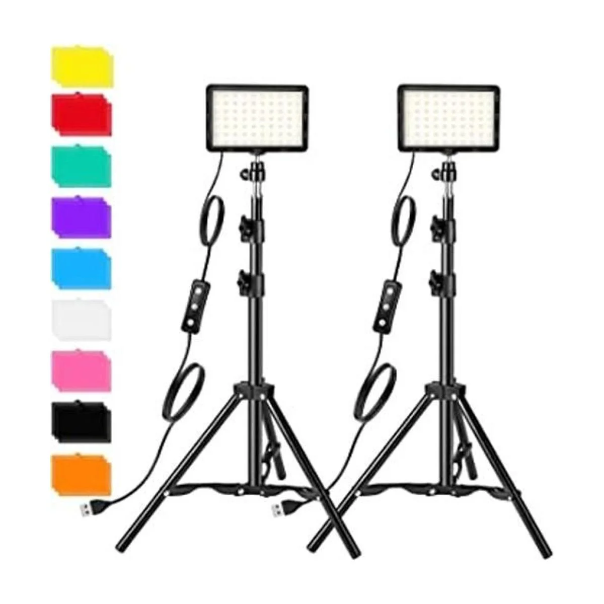 Lista del paquete y servicio al cliente: 18 filtros de color 9 colores, 2 paneles de luz LED de estudio con cable y soporte de trípode ajustable, 2 manuales de usuario idioma español no garantizado.
