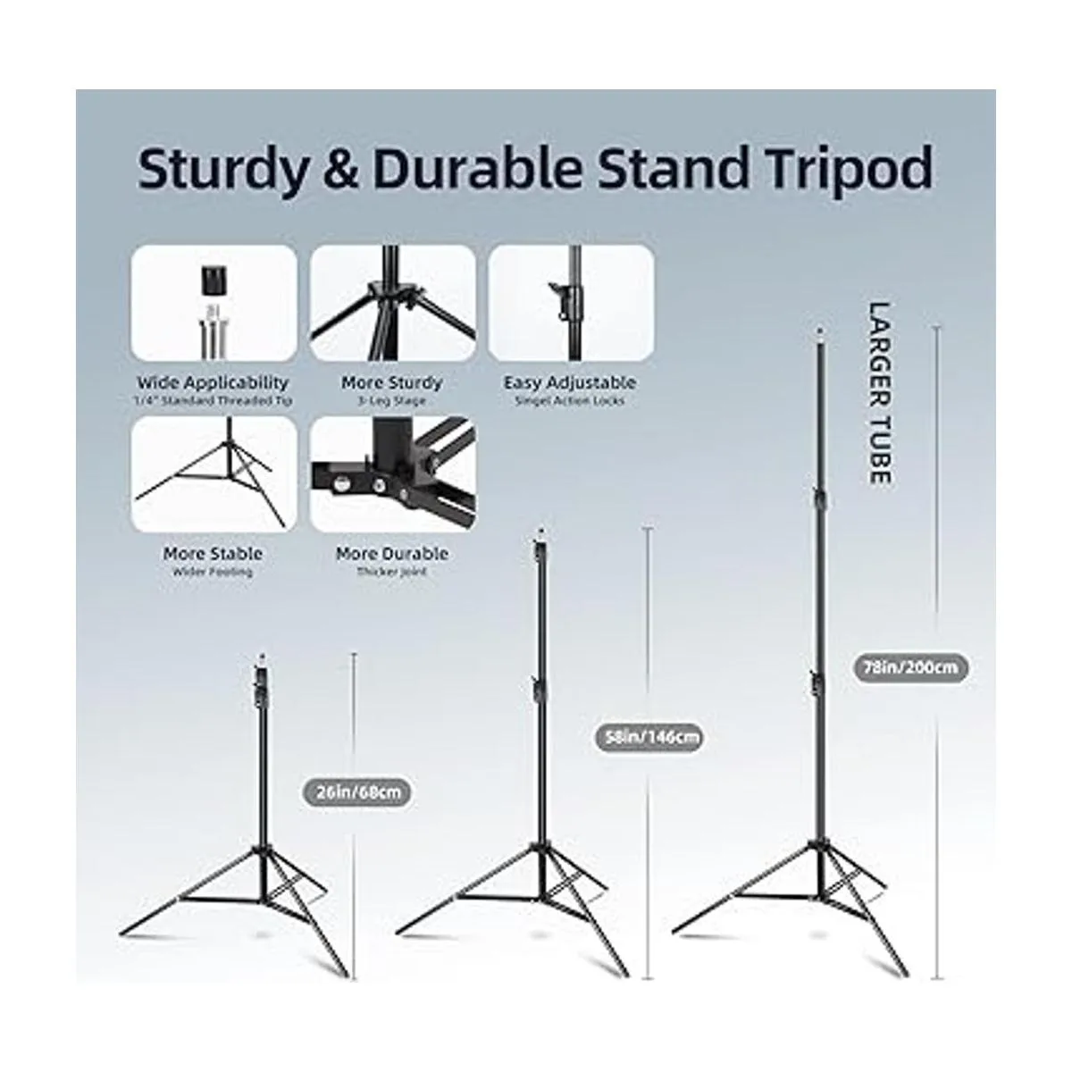 Cabezal giratorio y soporte ajustable: la altura del trípode del soporte de luz ajustable de 26.0 in a 78.7 in, patas de columna de 3 secciones, hechas de aleación de aluminio más resistente y estable. El ángulo puede ser un soporte de lámpara ajustable de 210, que puede adaptarse a diferentes disparos perfectos con punta de rosca estándar de 1/4 pulgadas. Y con cable extralargo de 98.4 in, mayor rango de movimiento conveniente para disparar fotografía.