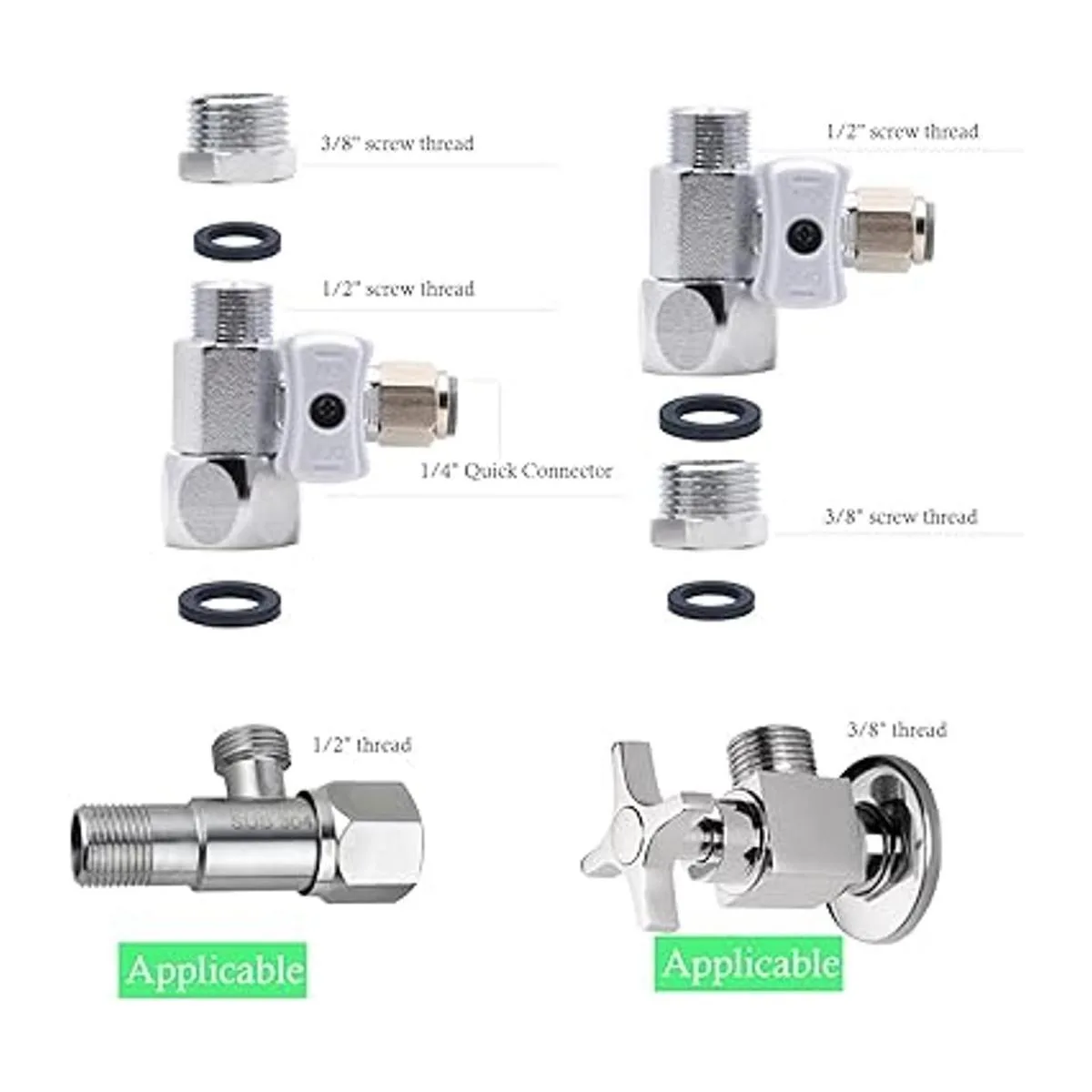 Se adapta universalmente a la mayoría de válvulas de cierre comunes de rosca de compresión de 3/8 pulgadas y rosca de 1/2 pulgada, se adapta a todas las válvulas de parada de ángulo estándar debajo del fregadero