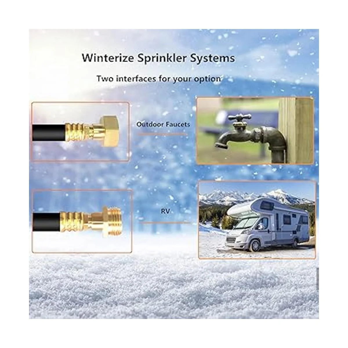 Ventaja: el adaptador de soplado invernal se aplica a tuberías de agua de jardín invernal, sistemas de aspersores, soplando agua de las líneas de agua/fontanería, reduce significativamente las aplicaciones de anticongelante, muy conveniente, seguro, saludable, respetuoso con el medio ambiente. La manguera flexible permite que el adaptador acceda a espacios reducidos y minimiza el estrés en tuberías y accesorios.