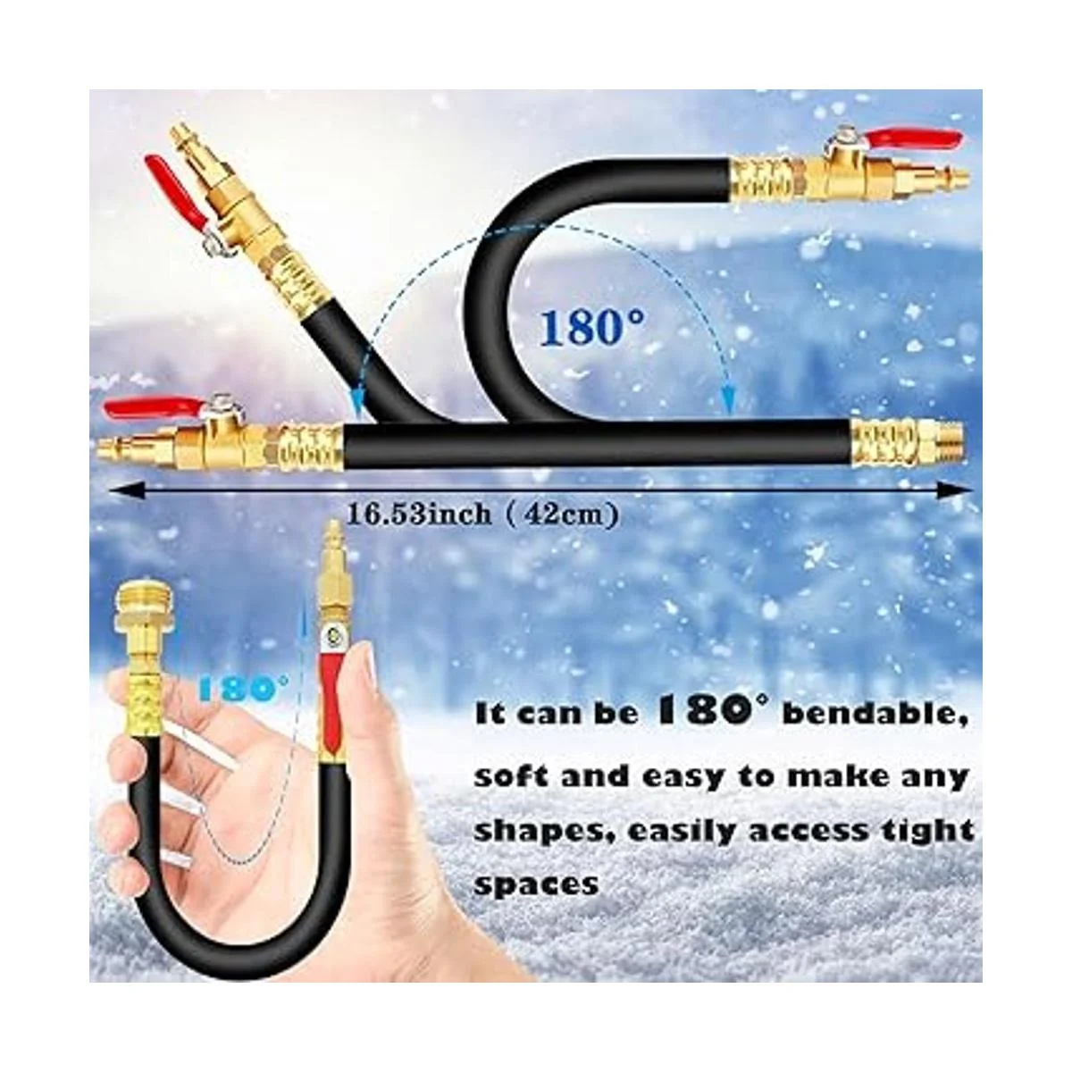 Latón sin plomo y manguera flexible: este adaptador de soplado de invierno RV está hecho de latón resistente con soportar altas temperaturas, resistente y resistente a la corrosión. La manguera está hecha de goma sintética, con excelente resistencia al calor, al frío y al envejecimiento que se puede doblar 180 en espacios estrechos sin anudar.