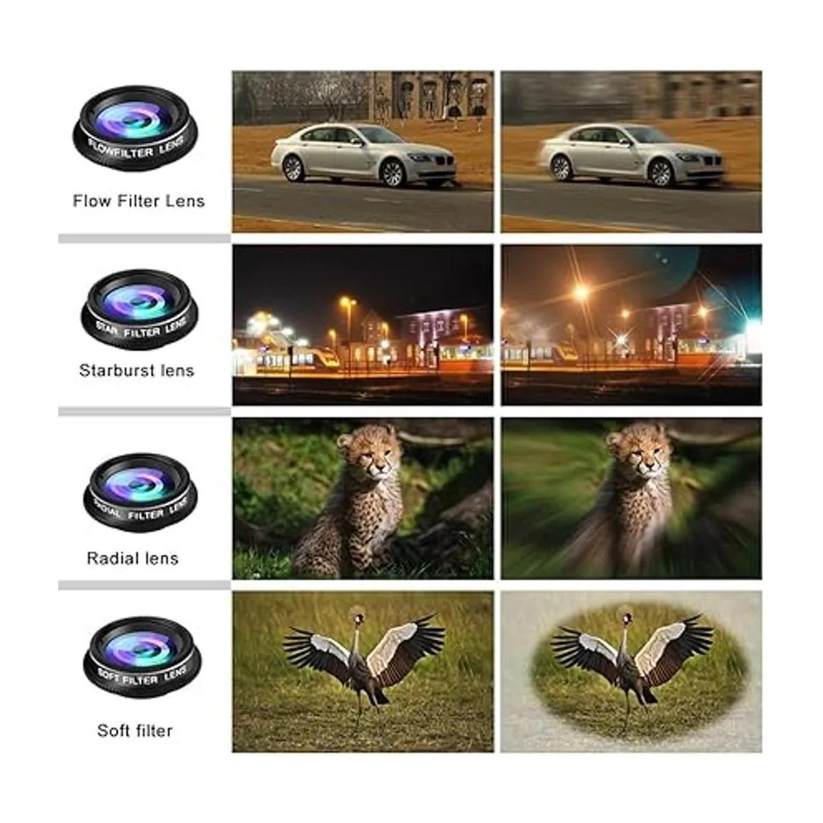 Kit de lente de cámara de teléfono, 11 en 1 para iPhone y Android, 0.63X Gran Angle15X Macro198FisheyeTelephotoCPLFlowRadialStarSoft FilterLente Caleidoscopio