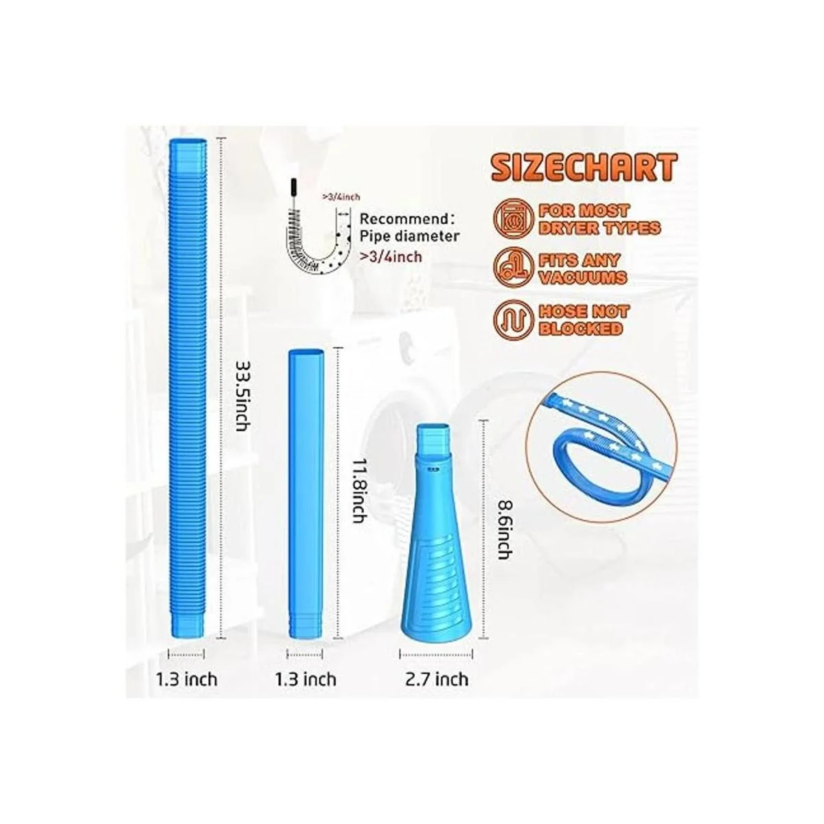 Diámetro de interfaz: 1.181 in2.441 in: la mayoría de las aspiradoras del mercado se pueden conectar a nuestro kit de ventilación de secadora, sin necesidad de utilizar convertidores, directo y simple.