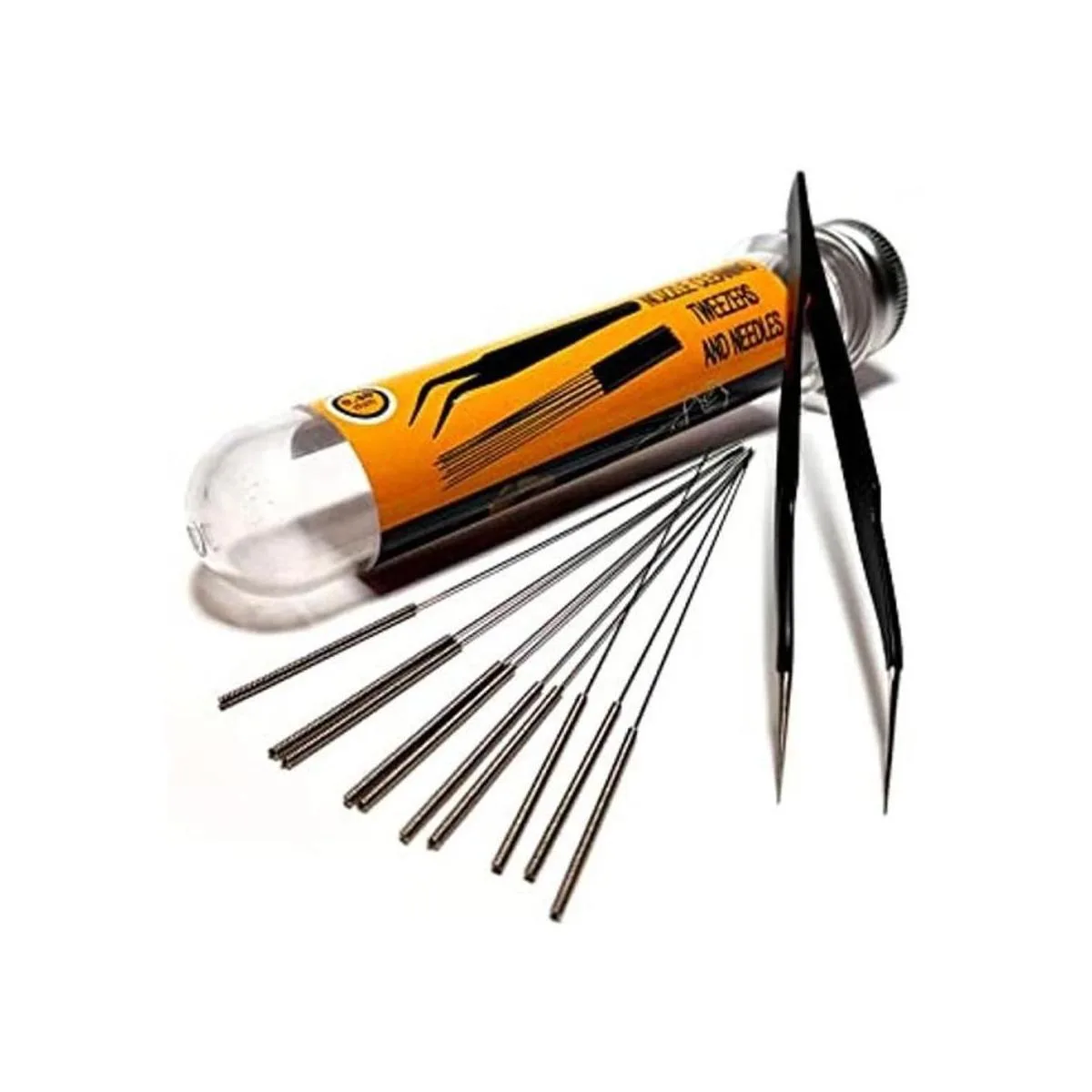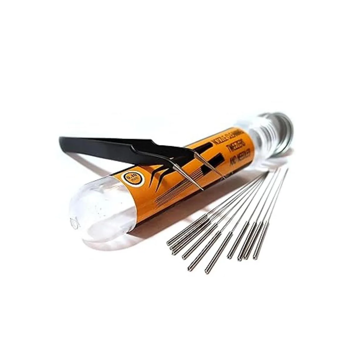 Gran valor: pinzas afiladas de calidad y 10 agujas de limpieza de boquilla de 0.016 in empaquetadas en un recipiente seguro