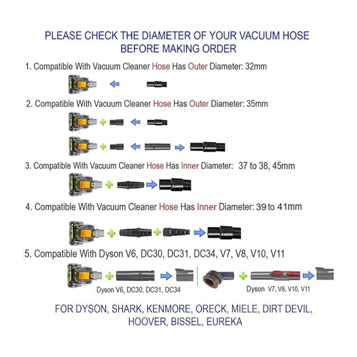 Vacext Adaptador de manguera: este adaptador se puede utilizar para conectar la aspiradora a accesorios de aspiradora de 1.260 in/1.378 in. Se convierte de 1 1/4 pulgadas a 1 1/4 pulgadas; de 1 1/4 pulgadas a 1 3/8 pulgadas; de 1 3/8 pulgadas a 1 1/4 pulgadas; de 1.417 in a 1.260 in/1.378 in; de 1.535 in a 1.260 in/1.378 in; de 1.772 in a 1.260 in/1.378 in. Comprueba el diámetro interior de tu manguera de vacío antes de realizar el pedido. Modelos no compatibles: no es compatible con Dyson V8/V11 Animal; no es compatible con Wet/Dry Shop Vac que tiene un diámetro de manguera de 2 1/2 pulgadas; no para Shark NV70, Shark ZU780