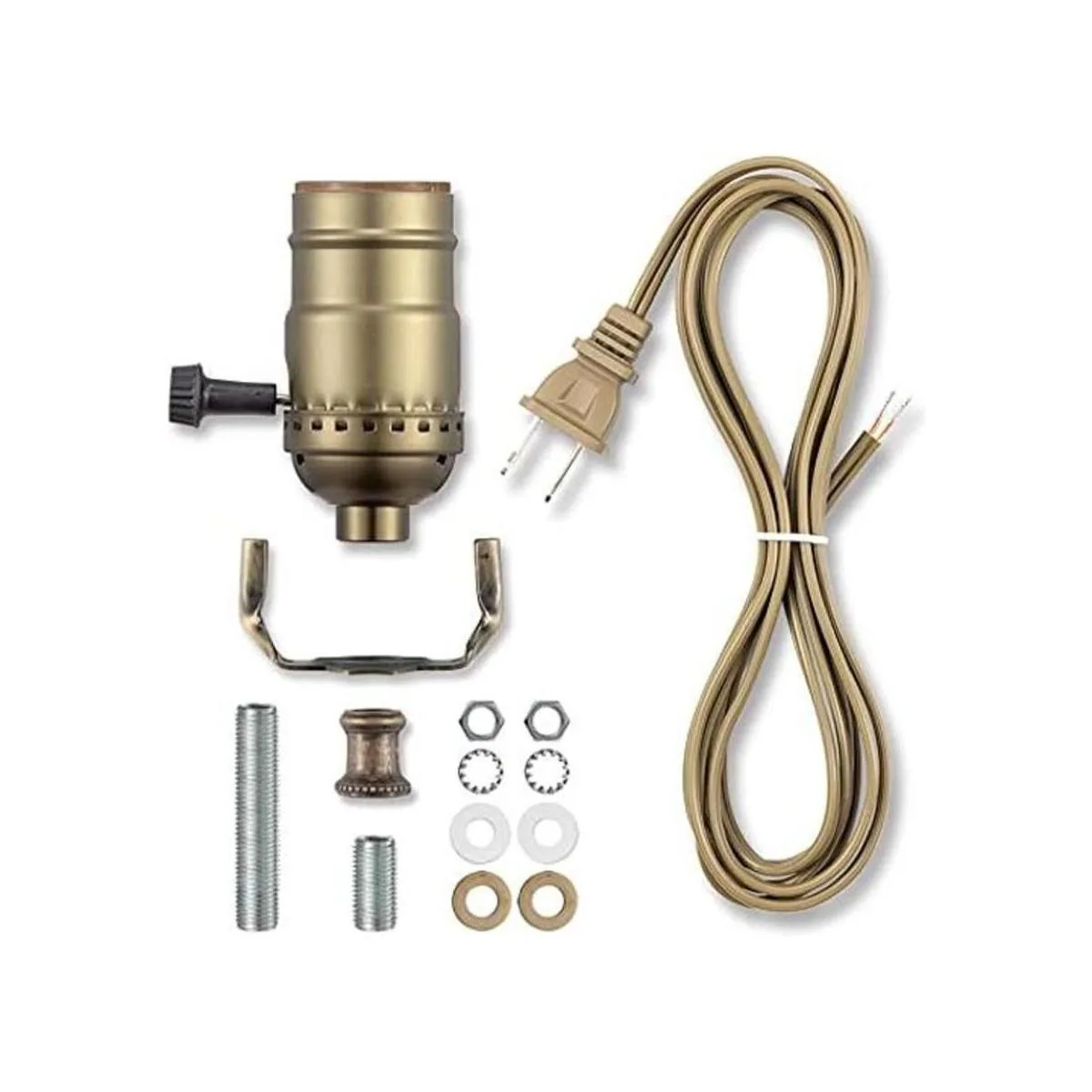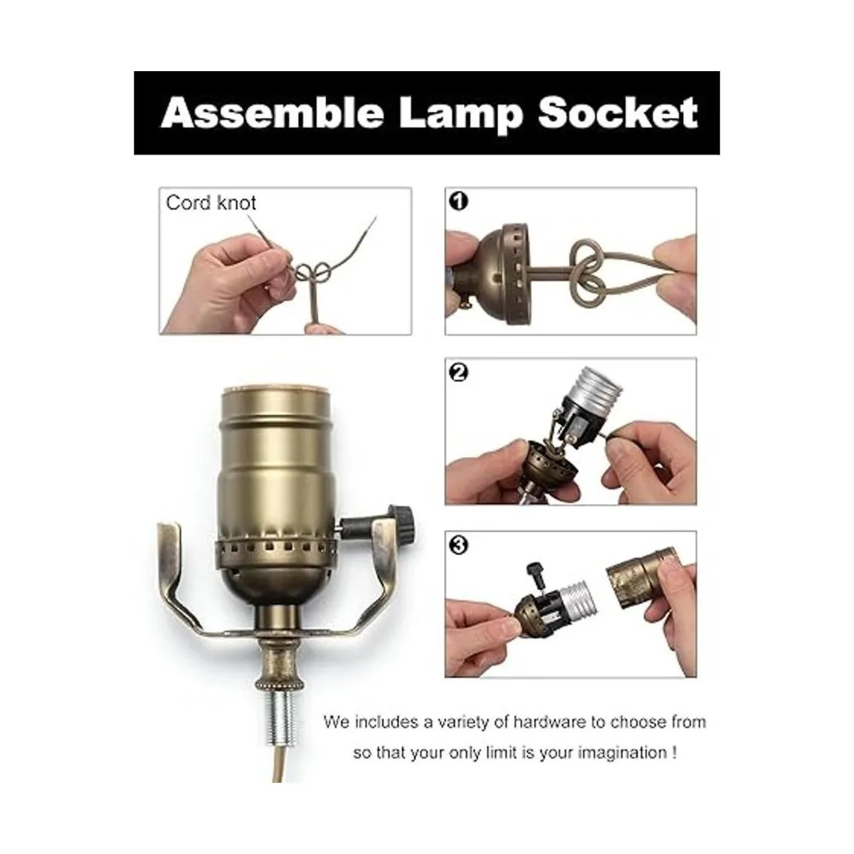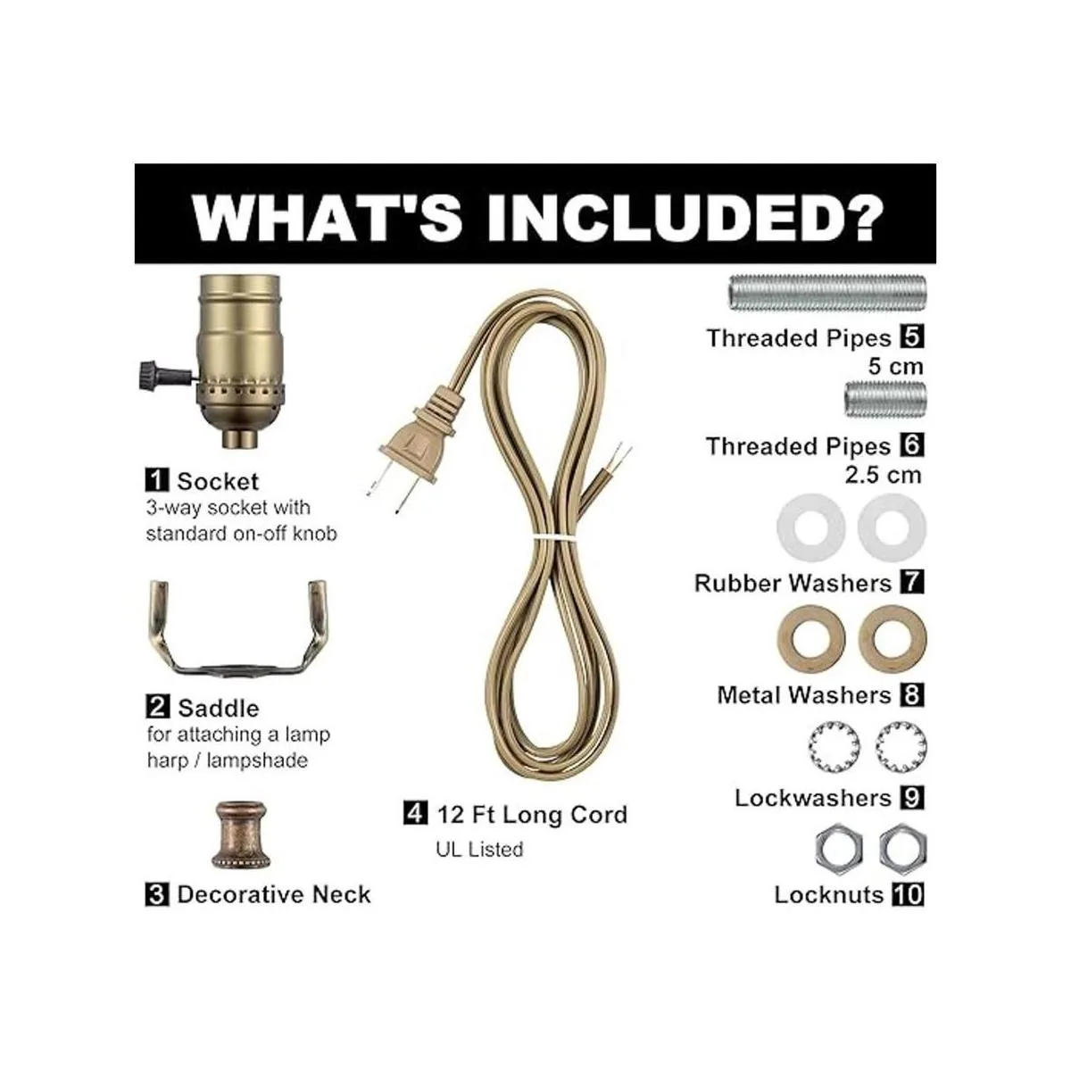 PACKAGE INCLUDES 1 x 12 feet brown lamp cord, 1 x 3way lamp socket, 1 x lamp harp base, 1 x decorative neck, 1 x 5 cm threaded pipes, 1 x 2.5 cm threaded pipes, 2 x metallic washers, 2 x rubber washers, 2 x lock washers, 2 x hex nuts.