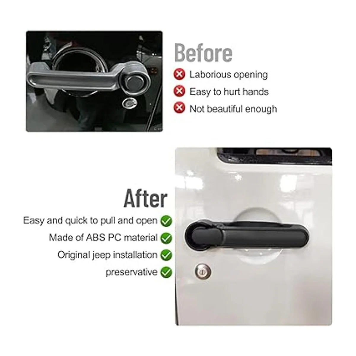 Fácil instalación: fácil y rápido de instalar, se adjunta cinta adhesiva de doble cara utiliza el resorte y la barra del mango original, son más resistentes y se adaptan a tu jeep