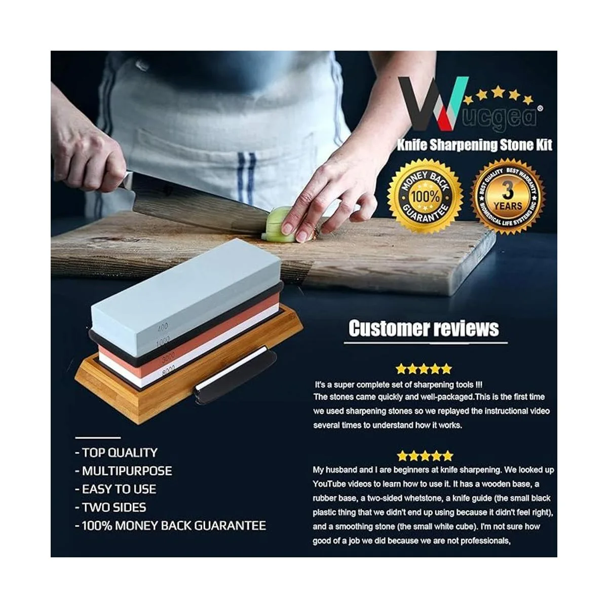 Piedra de afilar segura y fácil de usar: remoja la piedra de afilar en agua durante 5 a 10 minutos antes de colocarla en una superficie sólida, el juego de afilar cuchillos es extremadamente fácil de usar y fácil de usar, la piedra de afilar de cuchillos no requiere aceite de afilar caro. Todo lo que necesita para afilar es agua y la guía de ángulo para el ángulo correcto de la hoja.