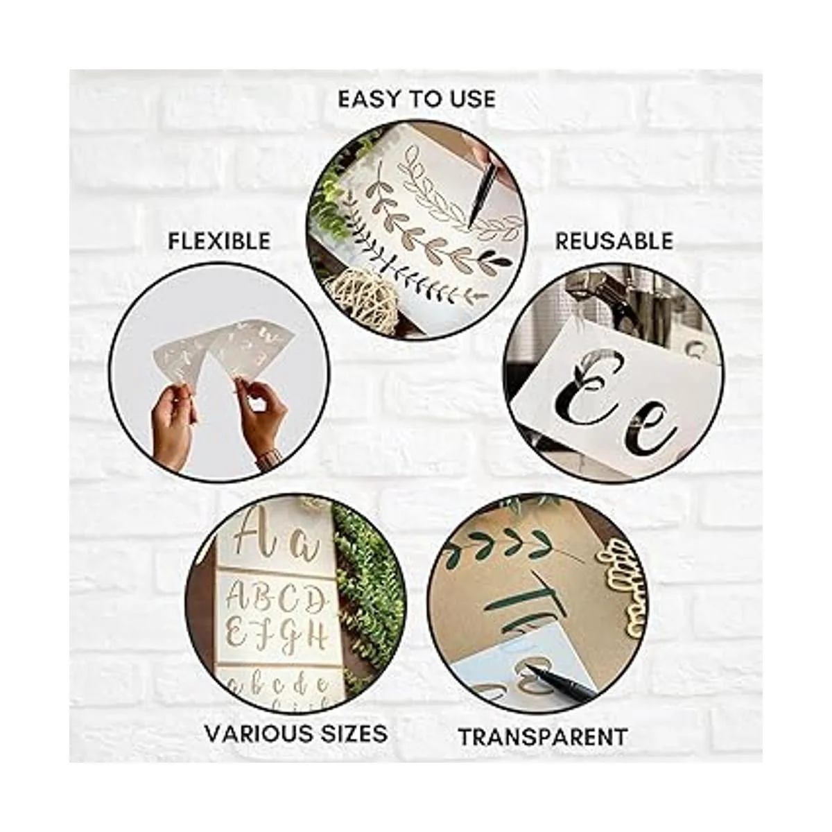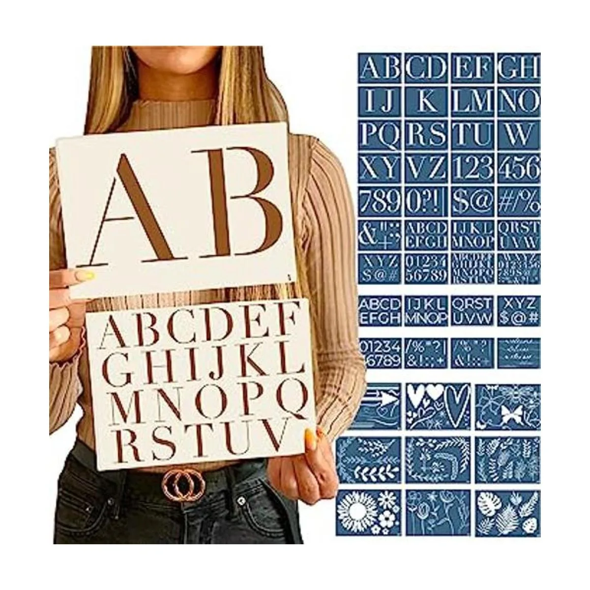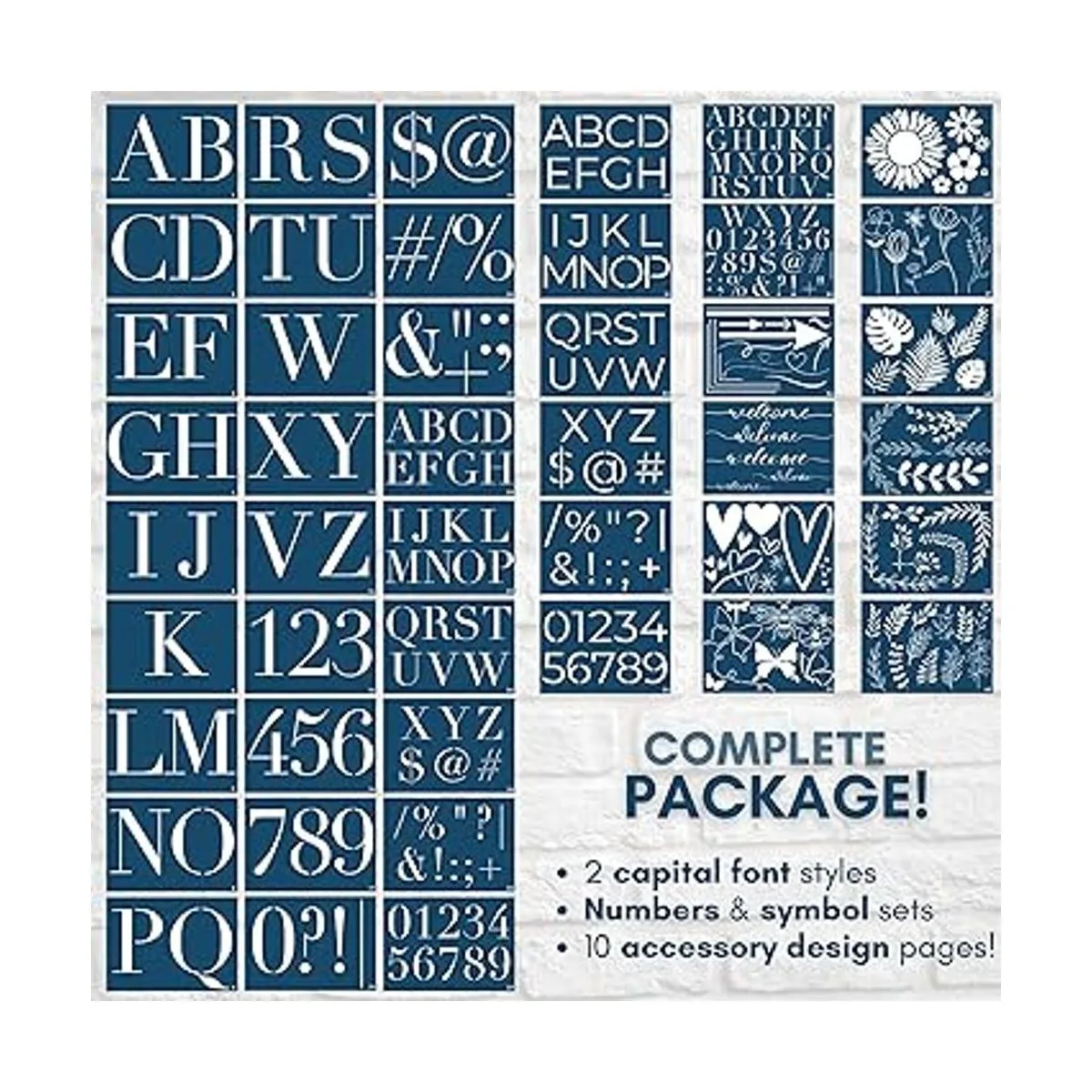 El paquete completo El kit incluye 4 letras mayúsculas un juego de letras de 4 pulgadas de alto, dos juegos de letras de 2 pulgadas de alto, un juego de letras de 1.25 pulgadas de alto. Cada juego incluye letras mayúsculas, números, símbolos comunes y hermosos diseños. 45 hojas de plantillas en total están incluidas con el paquete, lo que hace que este juego grande sea una ganga
