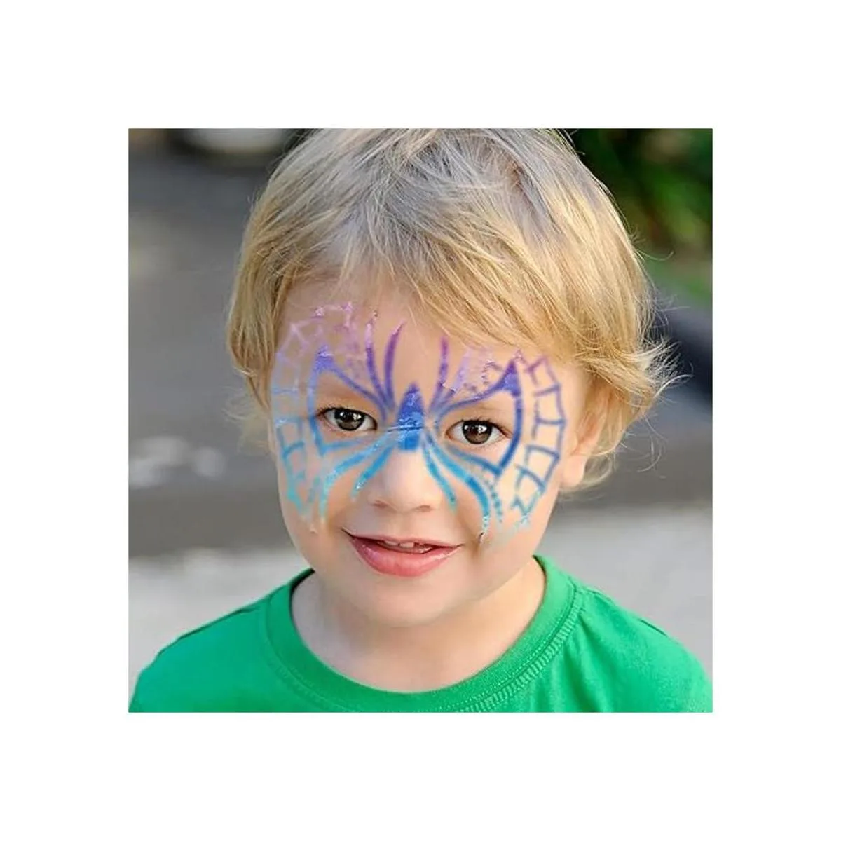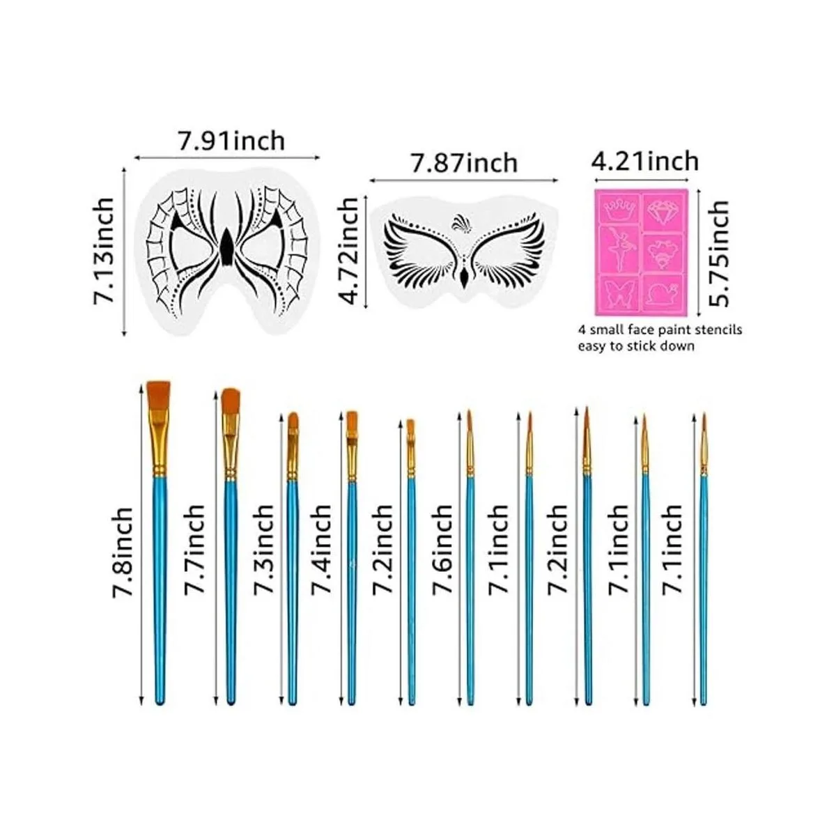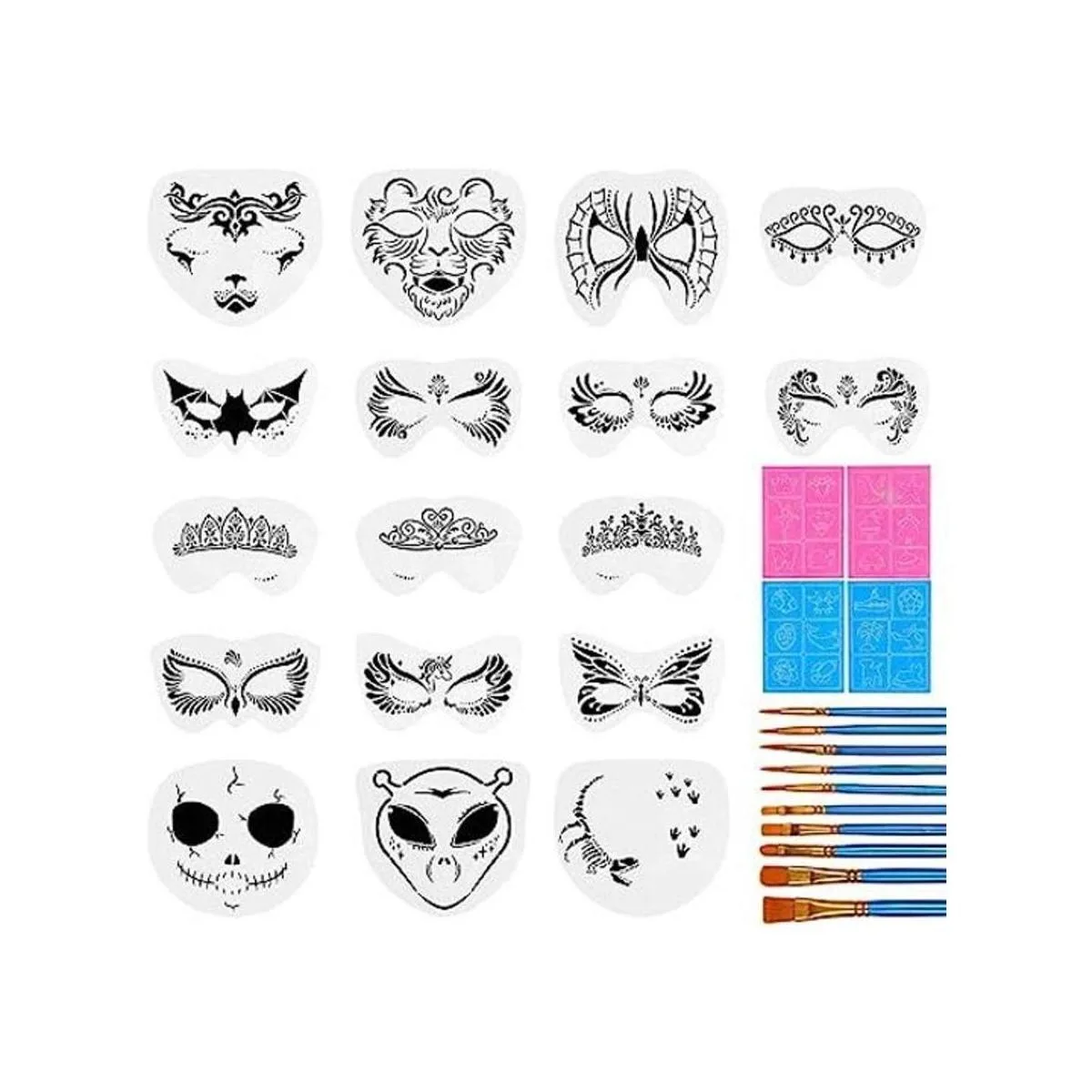 Kit de plantillas faciales de 31 piezas, 17 plantillas reutilizables de pintura de cara grande, 4 plantillas de pintura de palo pequeño y 10 pinceles de pintura para pintura facial de niños, plantillas de tatuaje, maquillaje de vacaciones de Halloween