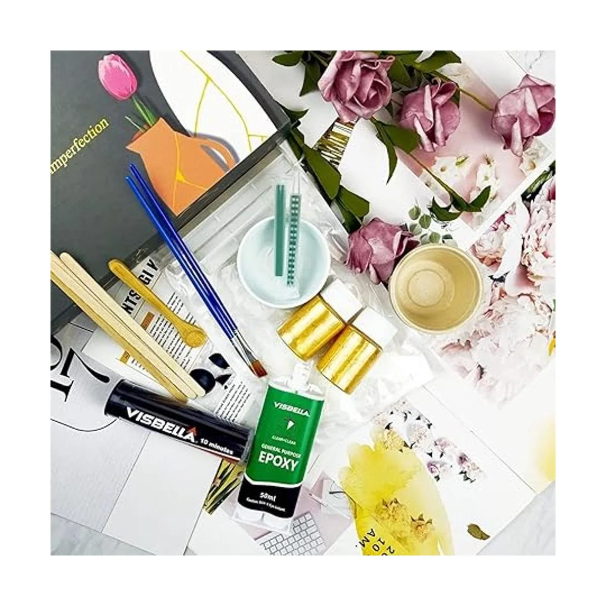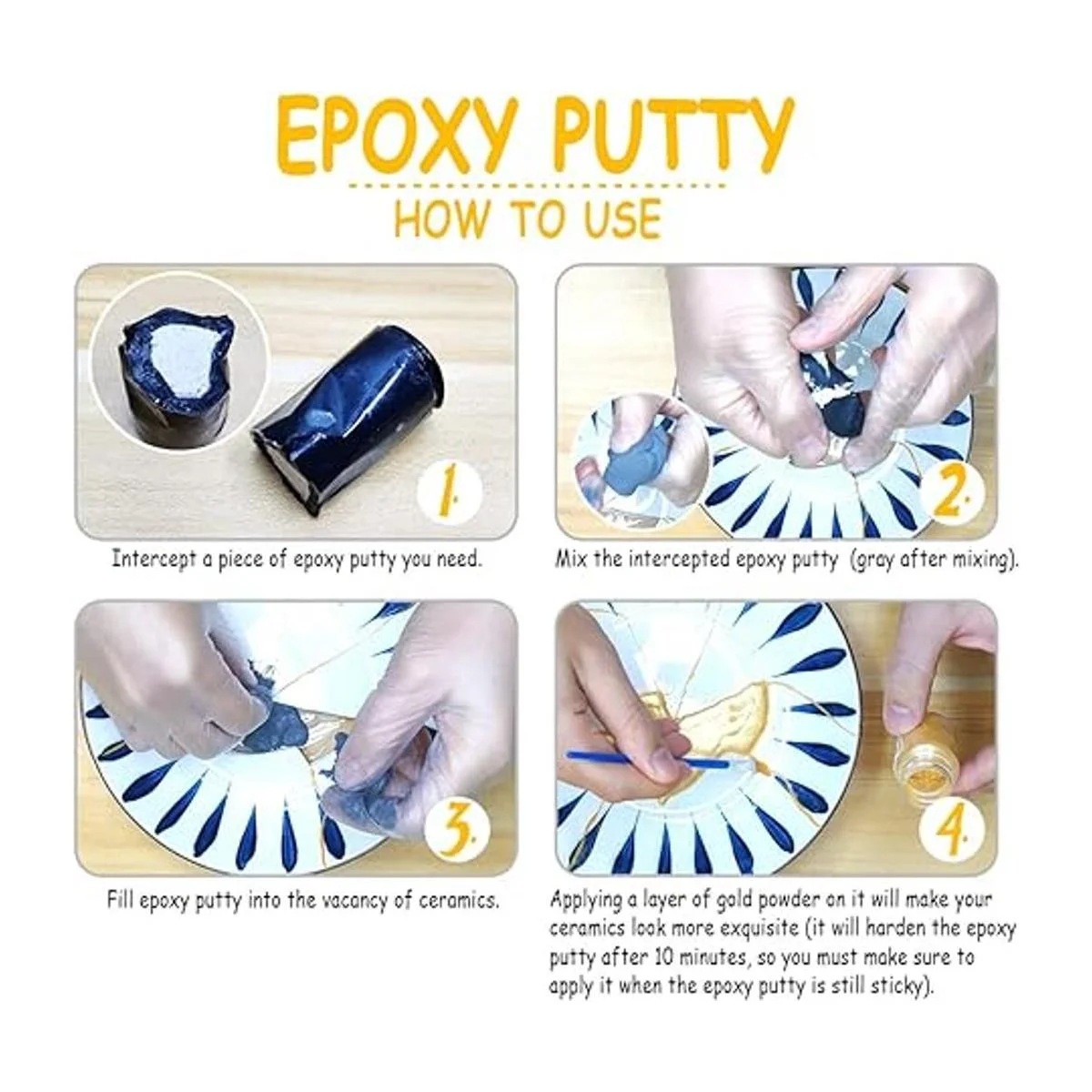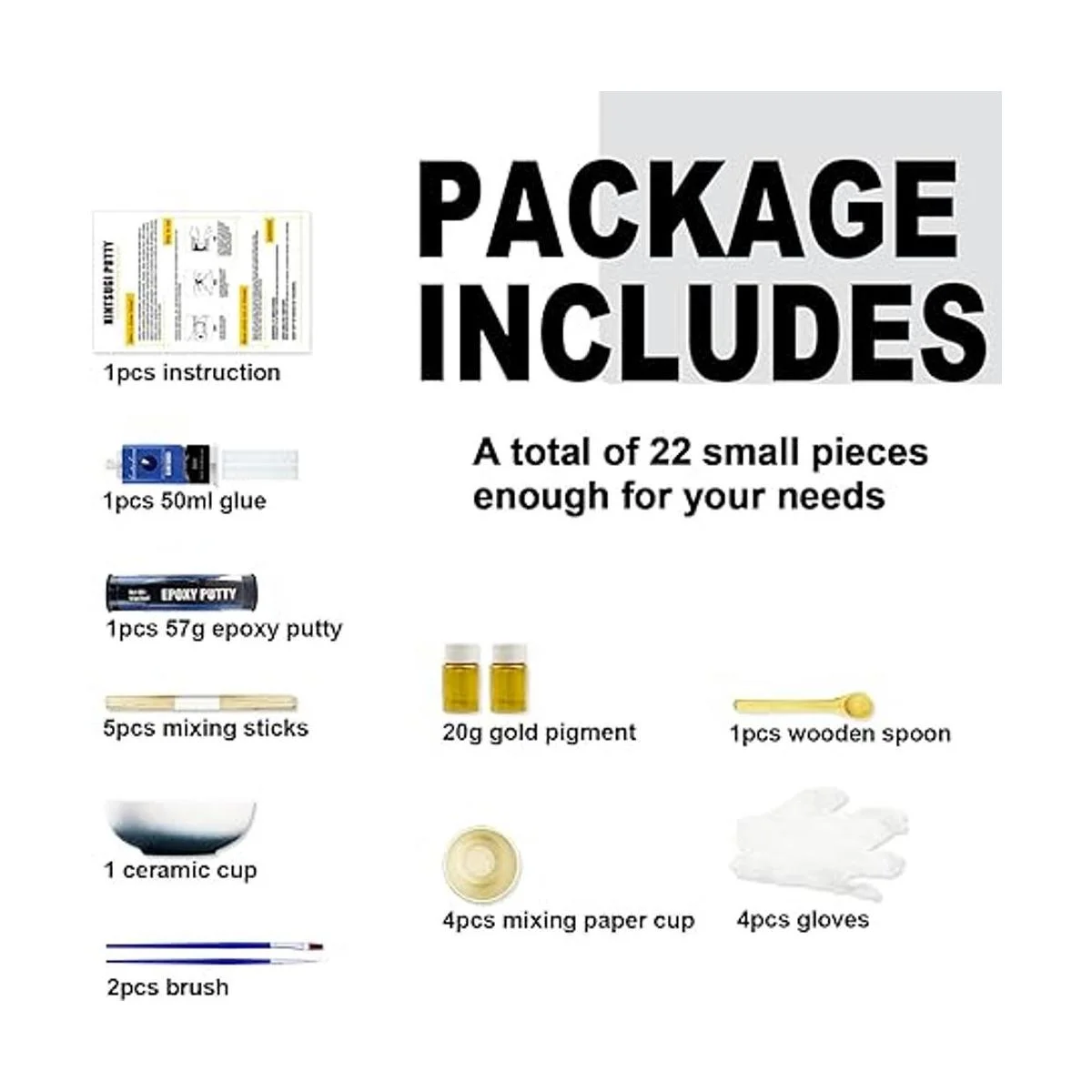 Gran capacidad para satisfacer tus necesidades: el paquete incluye instrucciones detalladas idioma español no garantizado, 1 pegamento de 1.7 fl oz, 1 masilla epoxi de 2.01 oz, 4 tazas de mezcla de papel, 1 taza de cerámica azul de práctica, 1 cuchara de madera, 2 pinceles, 5 palos de mezcla, 0.71 oz de polvo dorado, 4 guantes.