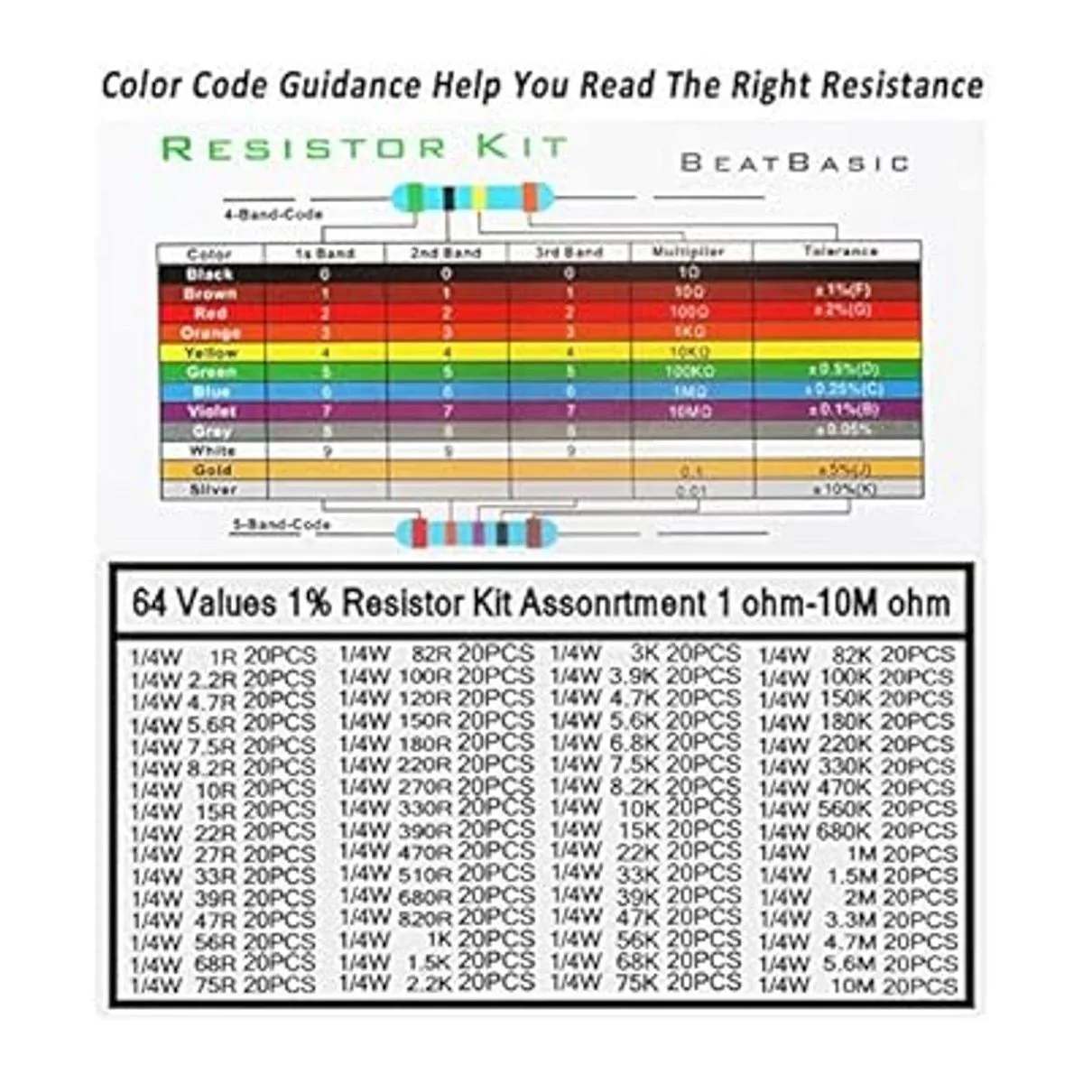 64 valores diferentes: el kit de resistencia incluye 64 valores diferentes, 1, 2.2, 4.7, 5.6, 7.5, 8.2, 10, 15, 22, 27, 33, 39, 47, 56, 68, 75, 82, 100, 120. 150, 180, 220, 270, 330, 390, 470, 510, 680, 820, 1K, 1.5K, 2.2K, 3K, 3.9K, 4.7K, 5.6K, 6.8K, 7 K, 7, 7 K, 7 K, 7 K, 7 K, 7 K, 7 K, 7 K, 7 K, 7 K, 7 K, .5 K. 8.2K, 10K, 15K, 22K, 33K, 39K, 47K, 56K, 68K, 75K, 82K, 100K, 150K, 180K, 220K, 330K, 470K, 560K, K, 68 0K, 1M, 1.5M, 2M, 3.3M, 4.7M, 5.6M, 10M.
