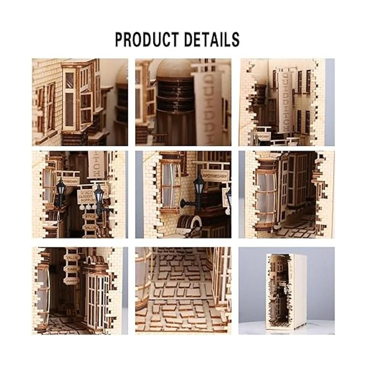 Proyecto de bricolaje: hablando con precisión, el kit de rincón de libro Diagon Alley no está diseñado para ser jugado, sino edificios coleccionables o decoraciones de estantería. Somos un grupo de fanáticos de escenas sin concesiones, utilizamos el método único de creación de rincón de libros de bricolaje para restaurar muchas escenas inolvidables. Tamaño del producto terminado: 7.4 x 3.9 x 10.2 pulgadas. Nota: el producto contiene el cuerpo principal del producto. No contiene pintura ni pilas.