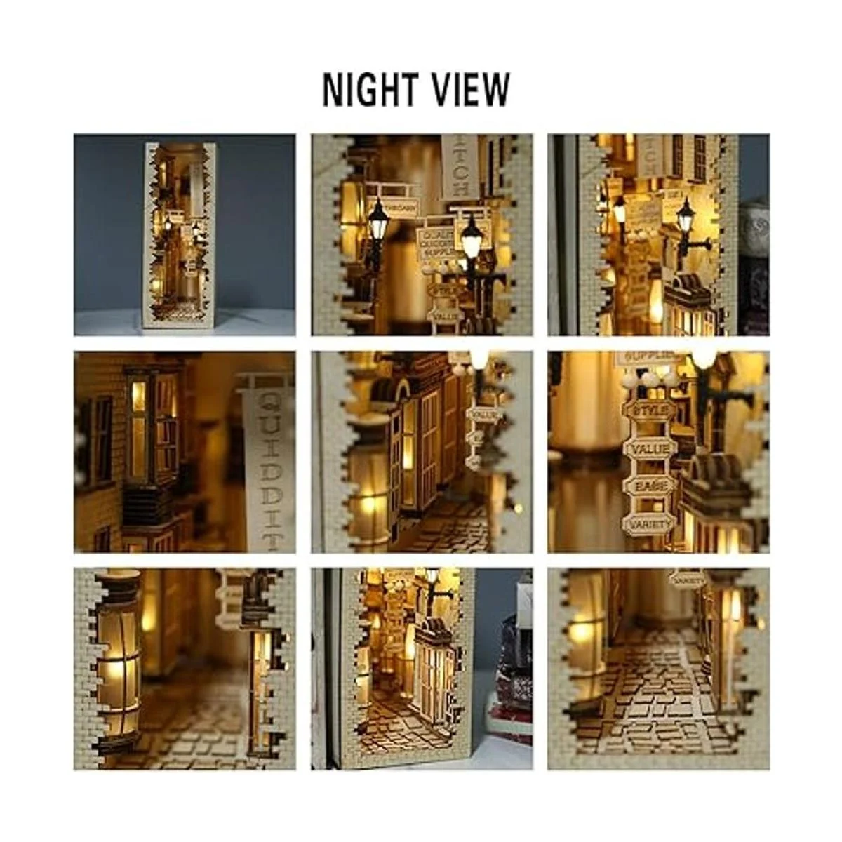 Lo que más vale la pena mencionar es que nos hemos unido al grupo de módulos de luz del interruptor. Las escenas de día y noche son geniales. A continuación, seguiremos la imagen detallada y luego caminaremos por la calle del soporte para sujetalibros Diagon Alley. Diagon Alley no es solo un divisor de esquina de libros, sino que también es una decoración agradable que puede acompañar a familiares y amigos a pasar su tiempo libre y promover relaciones emocionales.
