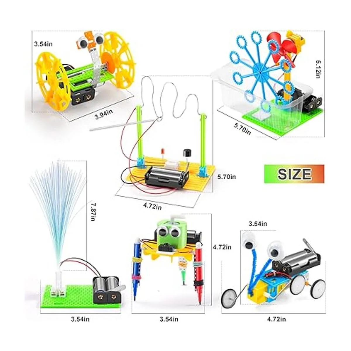 Kits STEM 6 en 1: estos kits de ciencia contienen un robot de reptiles, un coche de equilibrio, una máquina de burbujas, una lámpara de fibra y un kit de juego de alambre de zumbador. Los niños estarán orgullosos de construir su propio robot. Requiere no incluido: solución de burbujas, pilas AA.