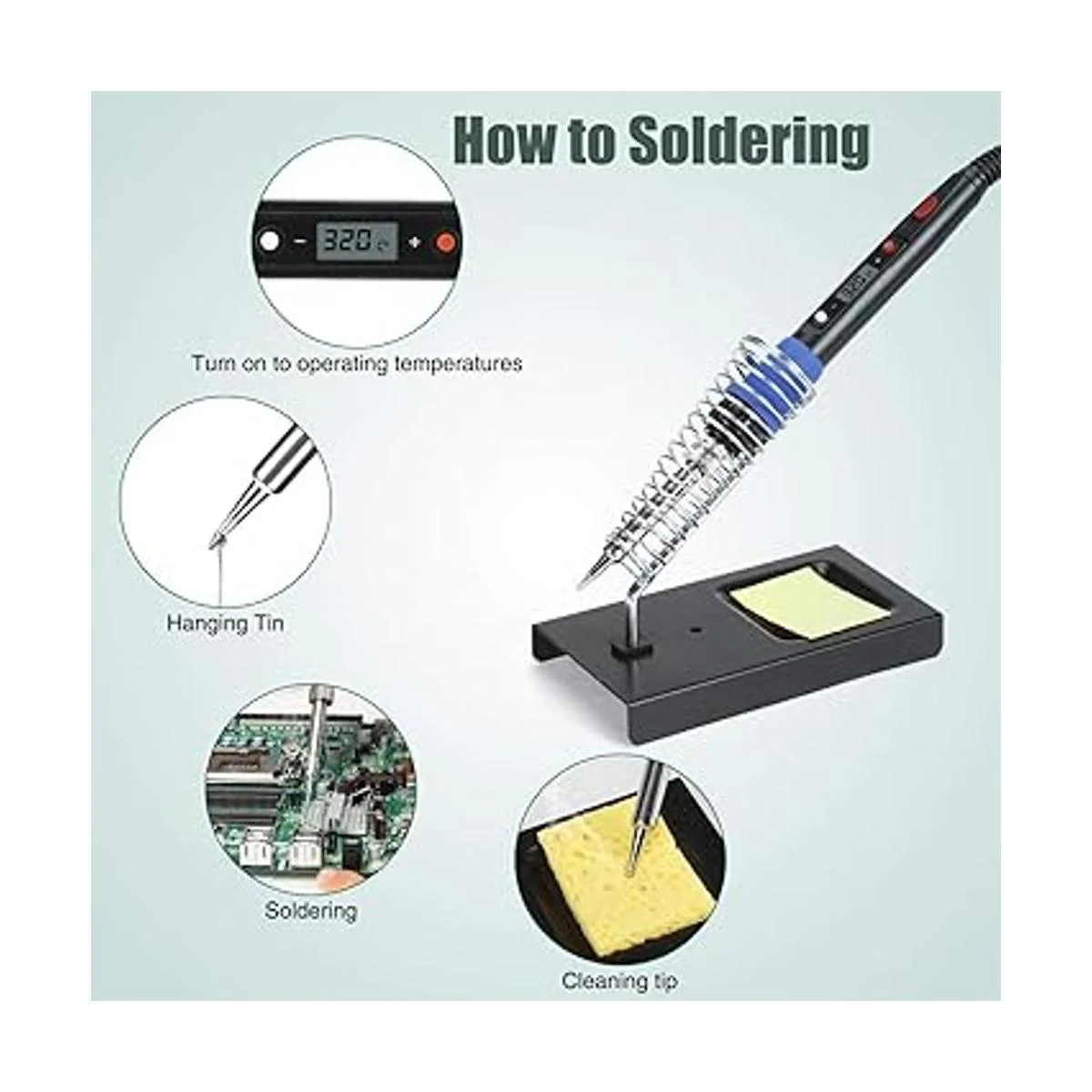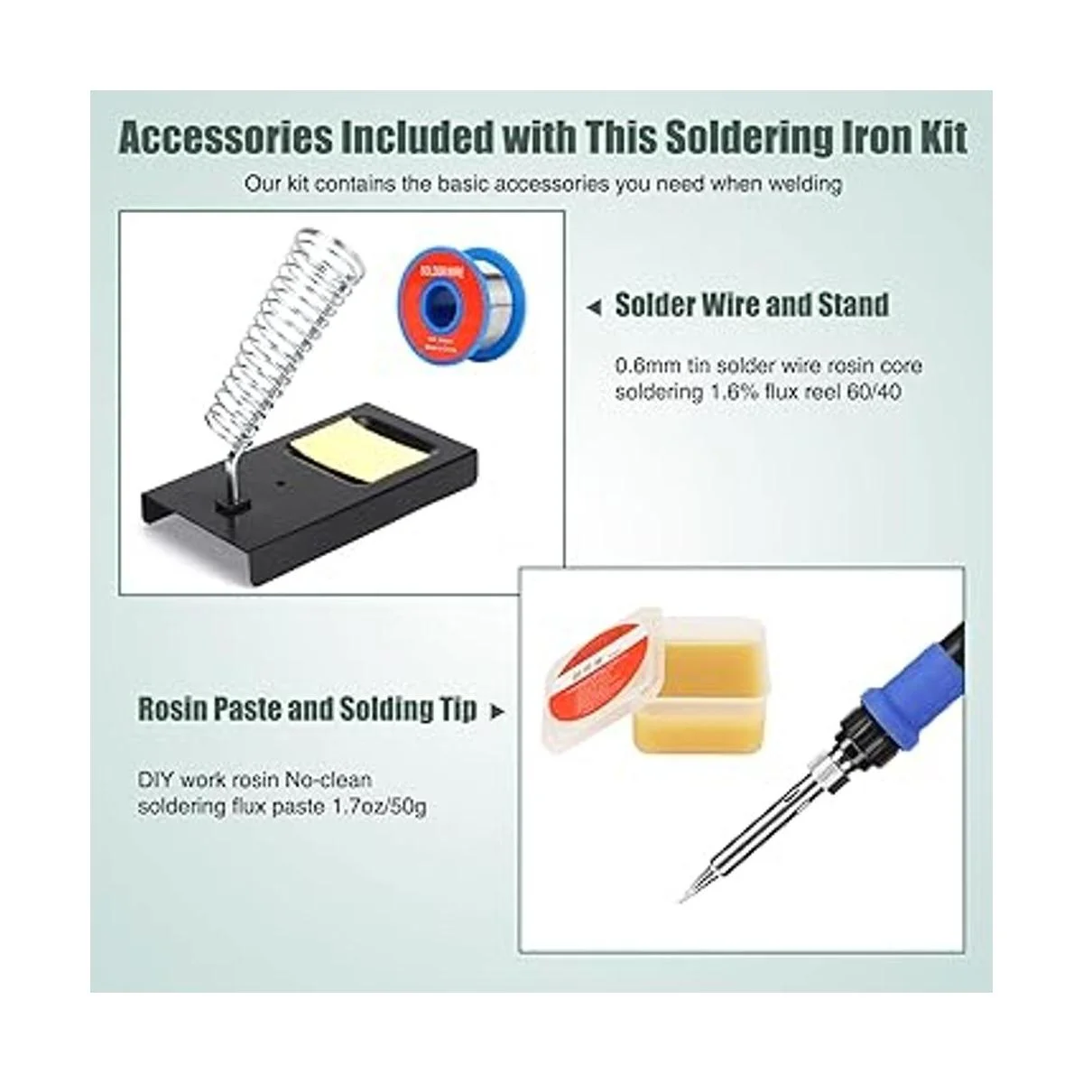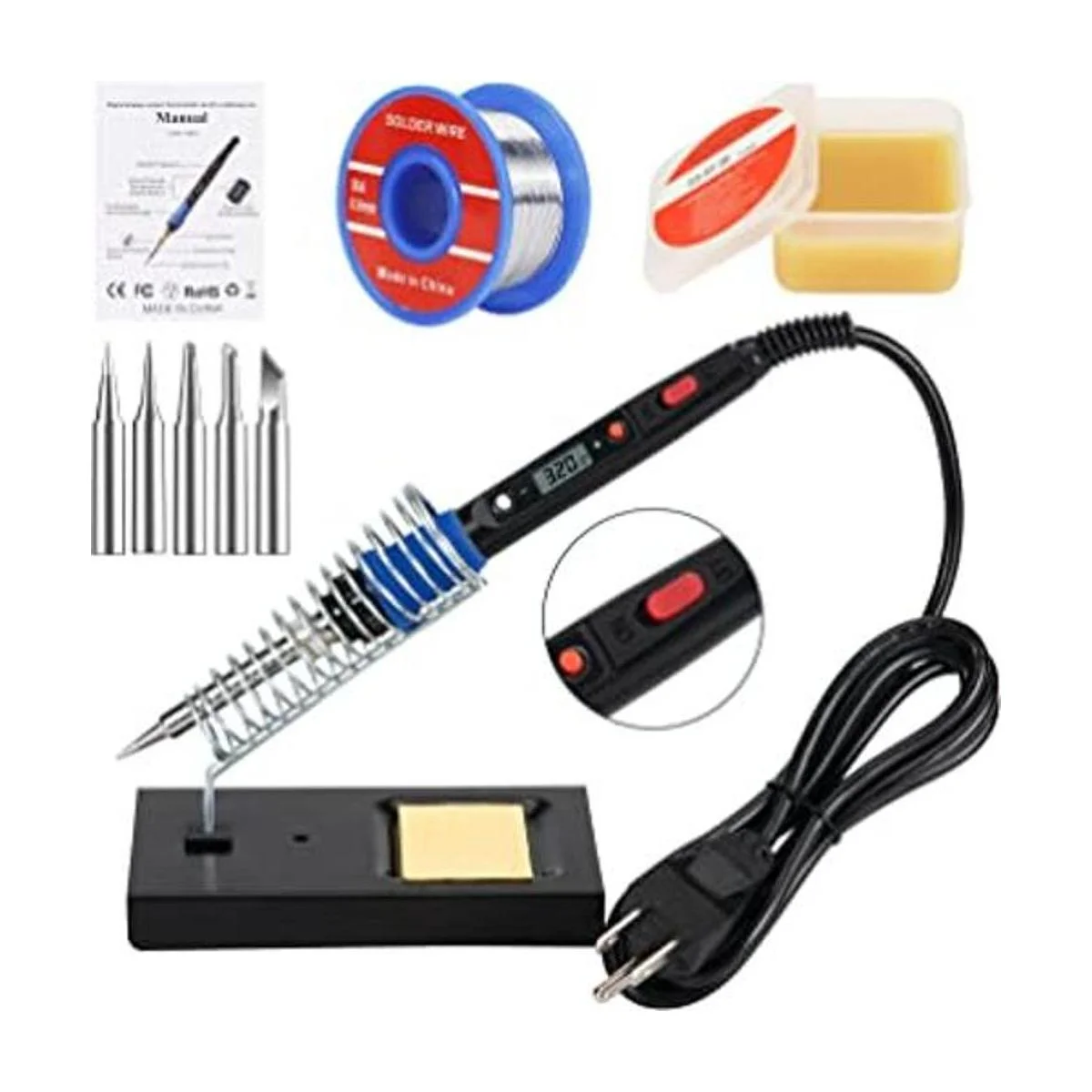 Kit de soldador imprescindible: el kit incluye soldador, punta de soldador de 5 piezas, soporte de soldador, esponja convencional, soldadura con núcleo de colofonia de plomo y estaño fino y pasta fundente de colofonia para soldadura sin limpieza.