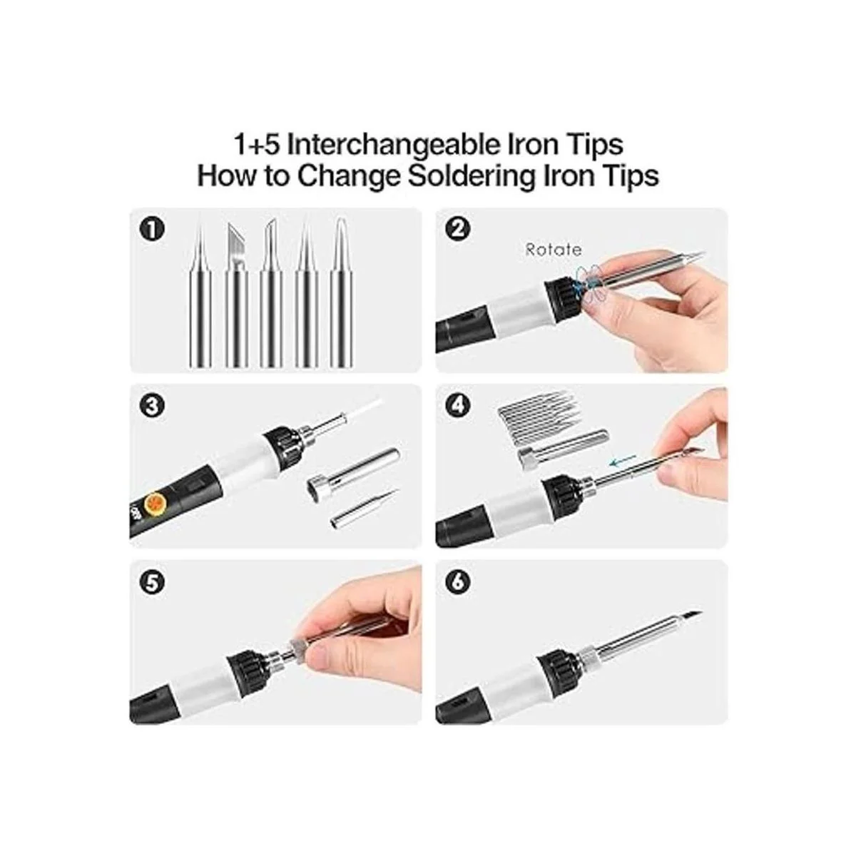 Kit de soldador 8 en 1: viene con soldador, 5 puntas de soldadura múltiples, tubo de alambre de estaño, soporte de soldador, satisface tus necesidades de proyecto de soldadura. El reemplazo de múltiples puntas es resistente a la oxidación y no se oxida fácilmente mientras se sumerge en agua.