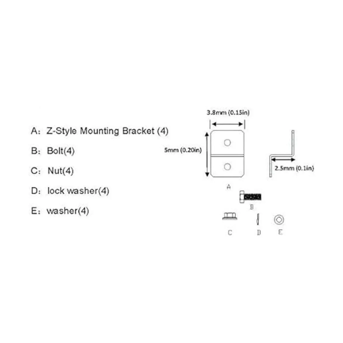Viene con 4 soportes Z, 4 de cada tuercas y pernos, 4 arandelas, 4 arandelas de bloqueo.