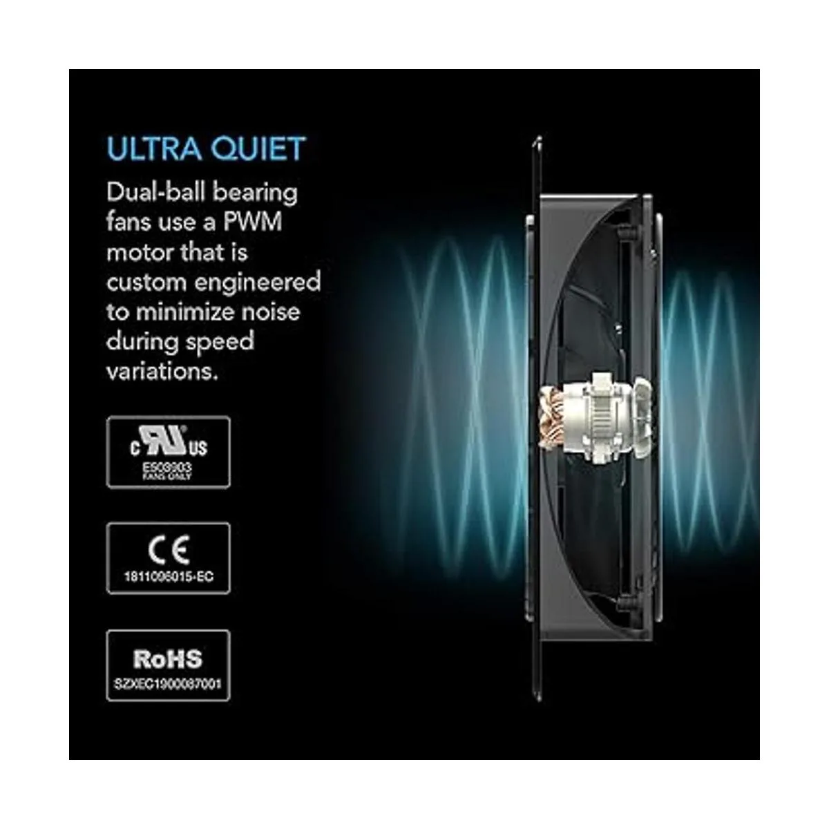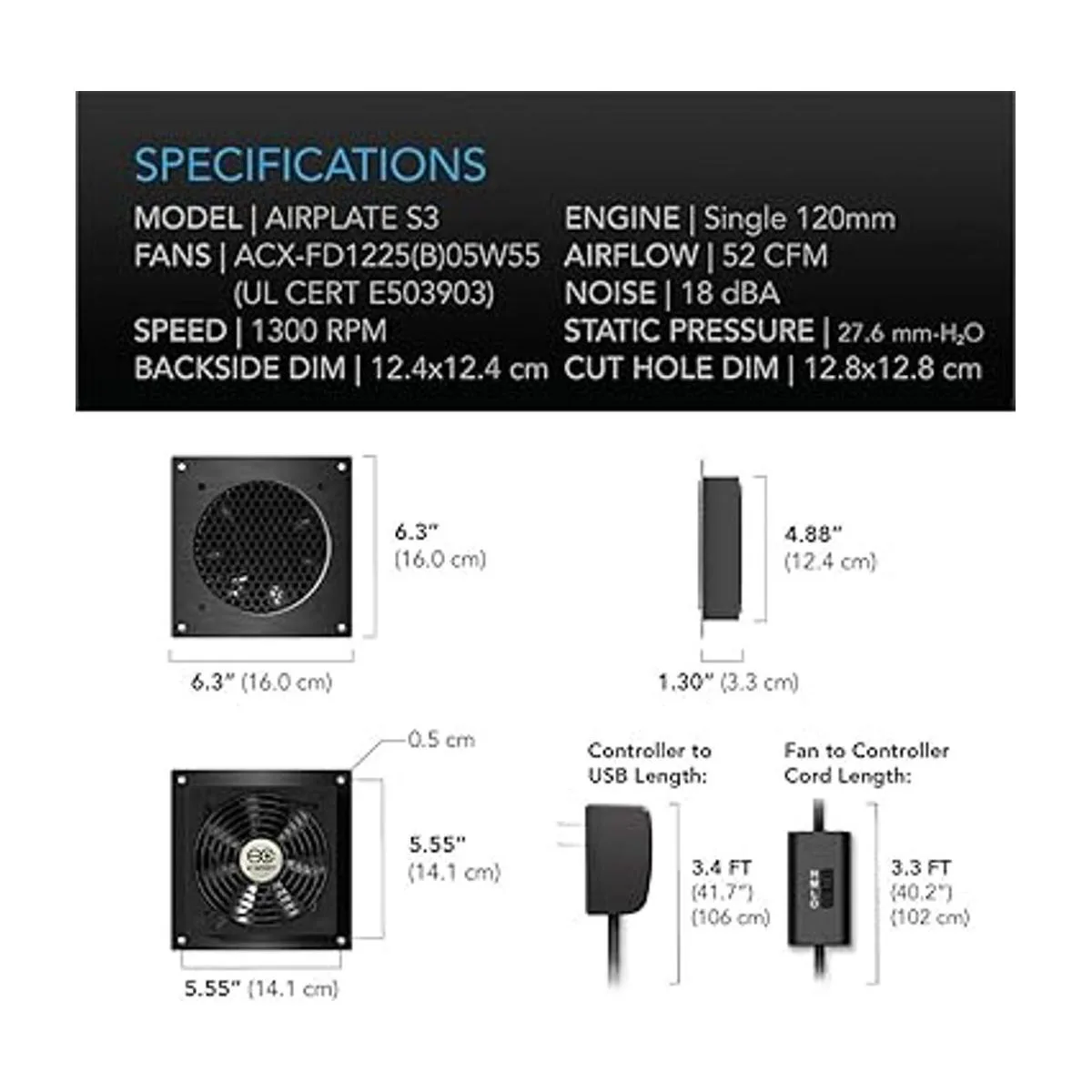 Dimensiones: 4.6 x 4.6 x 1.3 pulgadas. Flujo de aire: 26 CFM. Ruido: 22 dBA. Rodamiento: doble.
