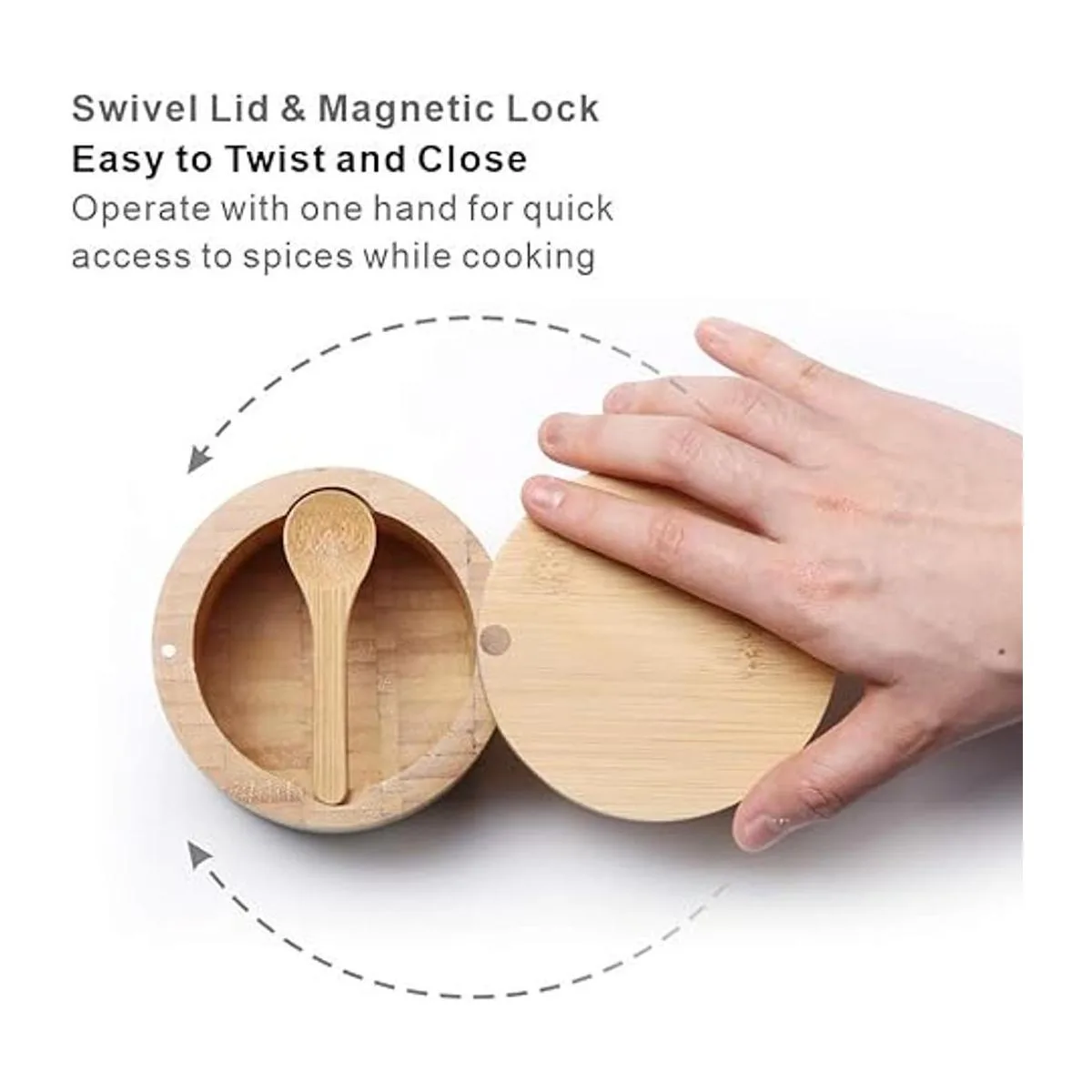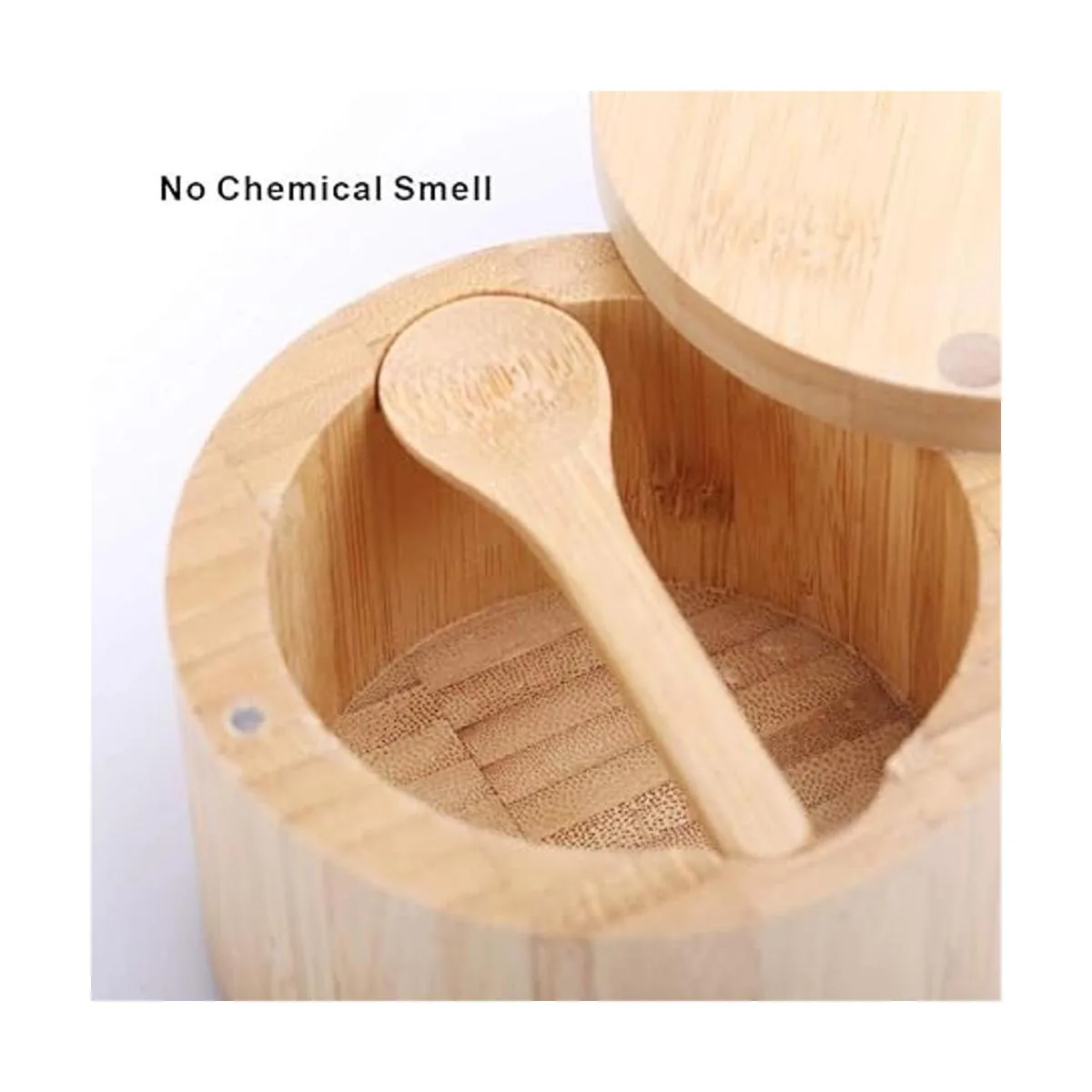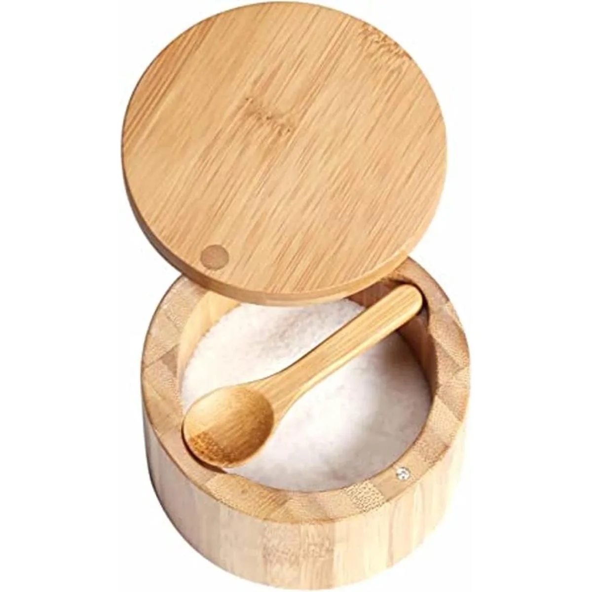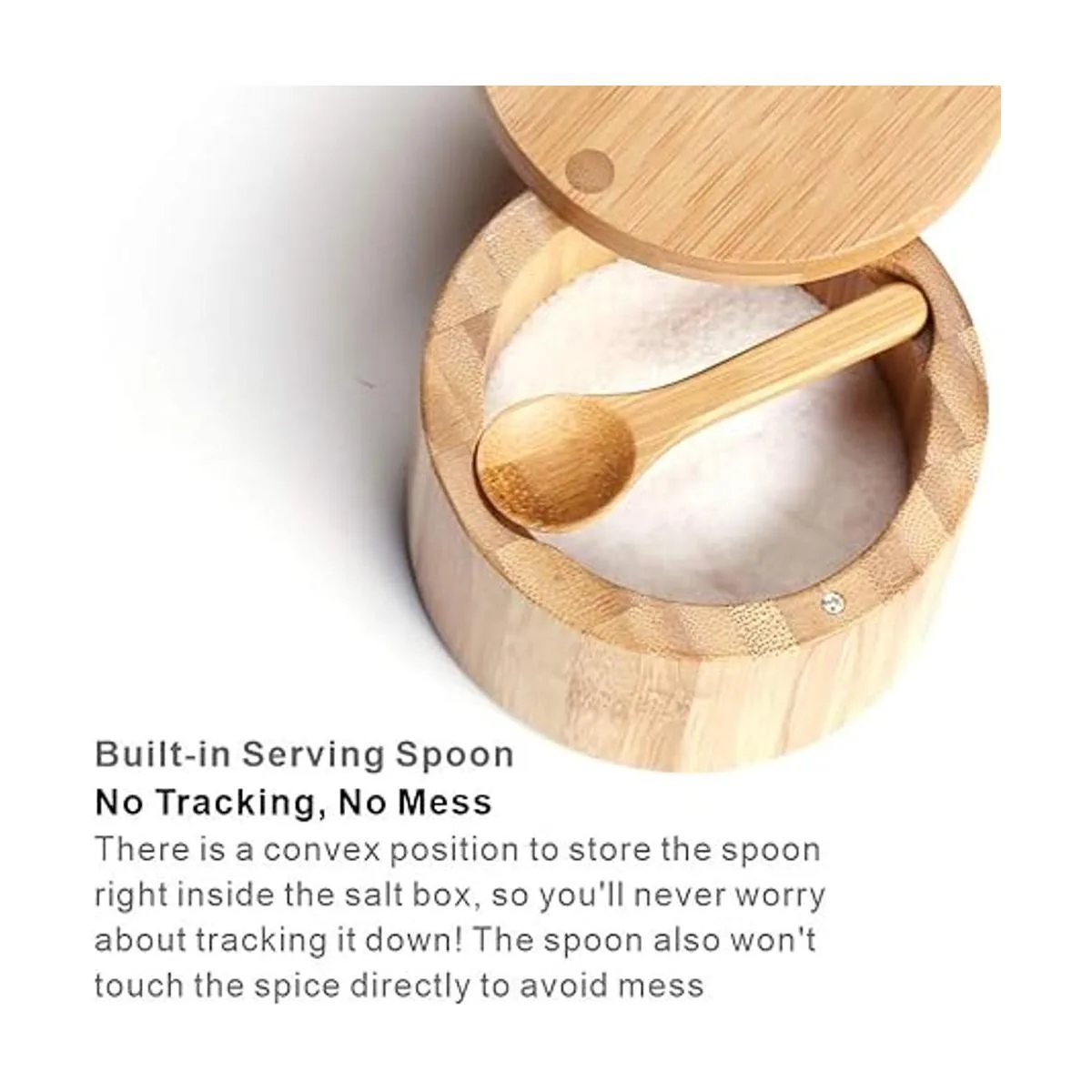 KITCHENDAO Caja de salero de bambú con cuchara integrada para evitar el polvo, elegante soporte de salina de cocina con tapa magnética giratoria para almacenar pimienta, especias, baño, sal marina, 6 onzas