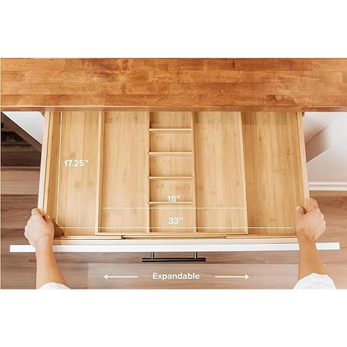 KitchenEdge Organizador de cajones de cocina ajustable para utensilios y basura, extensible a 33 pulgadas de ancho, 9 compartimentos, 100 bambú