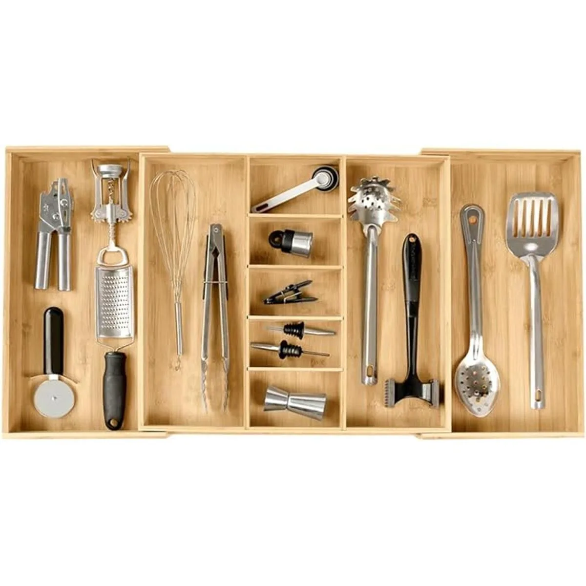 Crea configuraciones personalizadas: crea tu propia configuración personalizada para organizar tus utensilios de cocina, cubiertos y otros utensilios de cocina con hasta 9 compartimentos 2 fijos, 7 ajustables. Incluimos 4 separadores extraíbles en la sección central para hacer hasta 5 compartimentos más pequeños. Crea la configuración que mejor te convenga