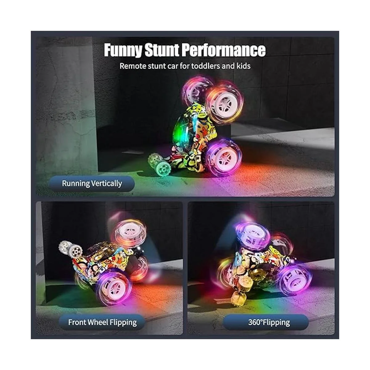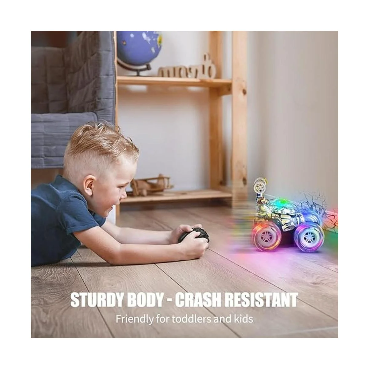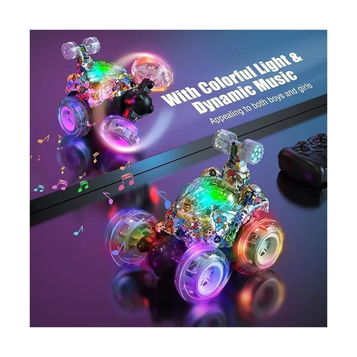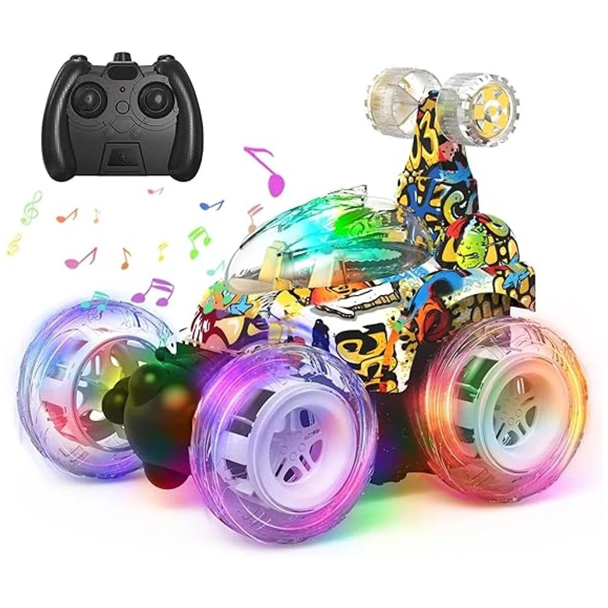 Kizeefun Auto de control remoto, auto de acrobacias a control remoto invencible 360 con luces coloridas e interruptor de música, auto de control remoto recargable para niños y niñas