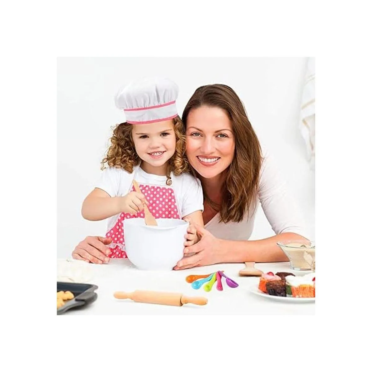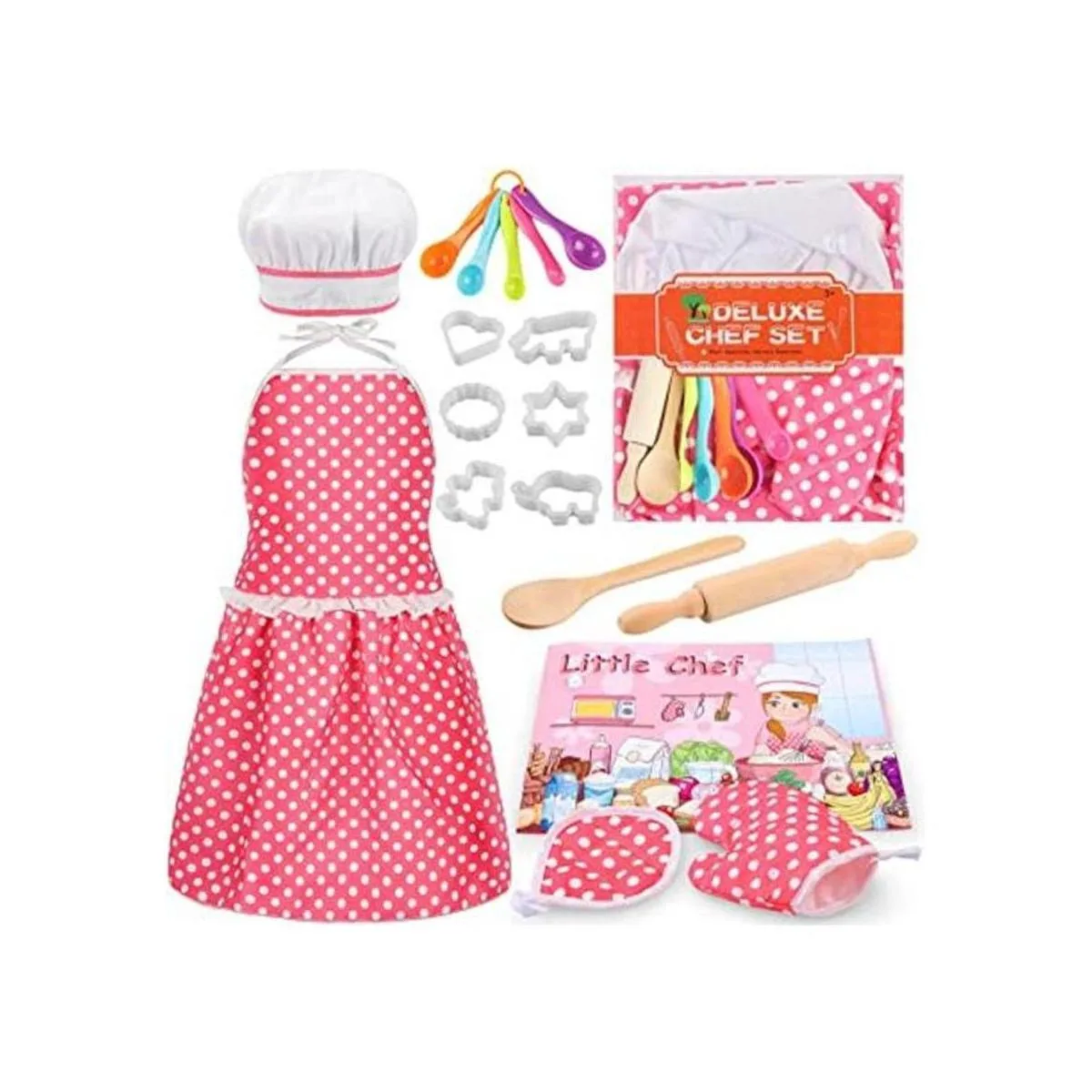 Juego completo de delantal de chef de galletas: 1 sombrero de chef, 1 delantal, 1 almohadilla caliente, 1 guante de horno, 1 cuchara de madera, 1 rodillo, 5 cucharas medidoras, 6 cortadores de galletas, 1 libro de cocina. Apto para todas las necesidades de cocina y horneado del pequeño chef. Todos los accesorios del kit de chef son lavables y probados en seguridad, fáciles de almacenar o transportar.