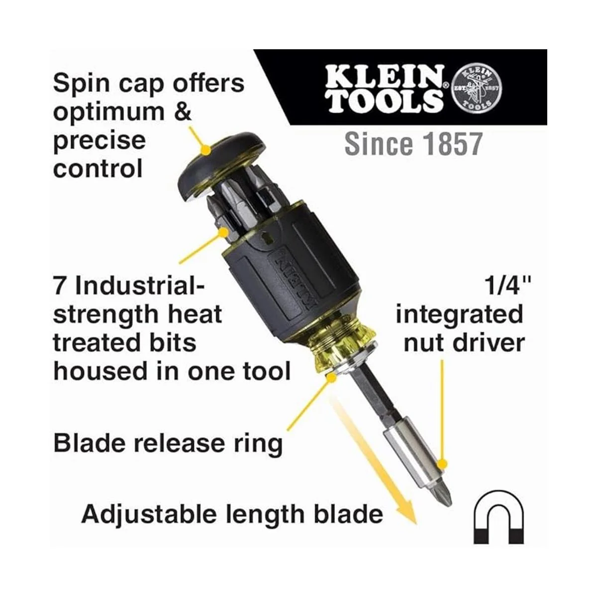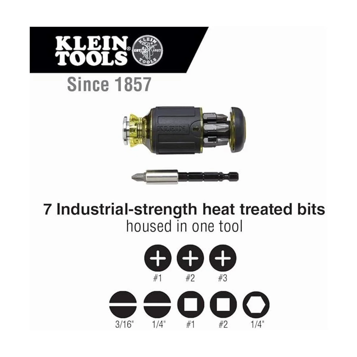 Klein Tools 32308 Destornillador de Stubby Multibit, Herramienta magnética ajustable con 8 en 1 de impacto con Phillips, ranurado, cuadrado y con controlador de nueces
